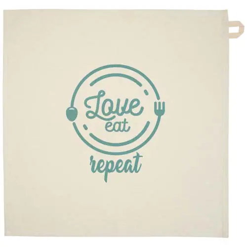Keukenhanddoek van 100% GRS gecertificeerd gerecycled katoen van 200 g/m² , met een opvallende contrasterende lus. Handdoekformaat: 50 x 50 cm.
