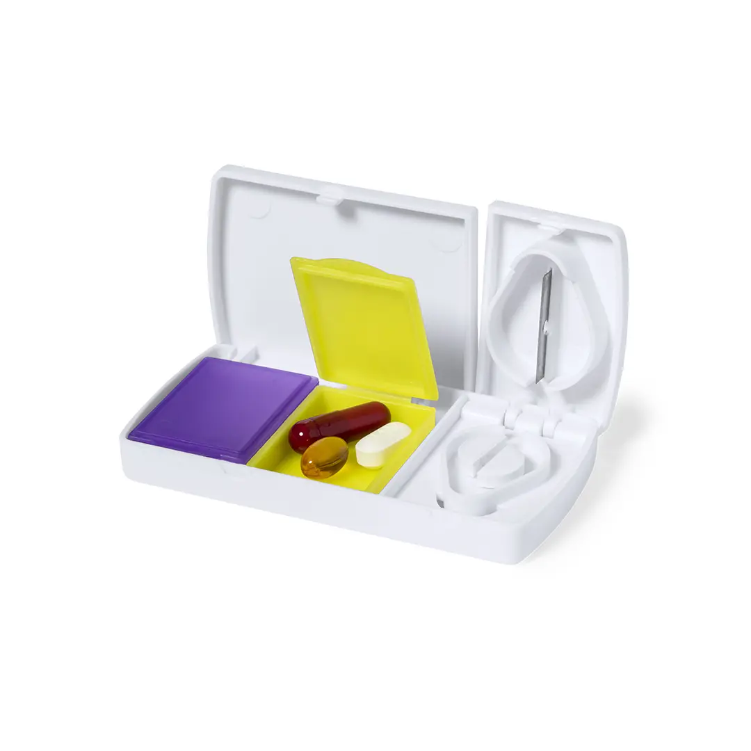 Pillendoos gemaakt van zacht en bestendig materiaal in wit. Met 2 binnenvakken, veiligheidssluiting en een mes om pillen te splitsen.