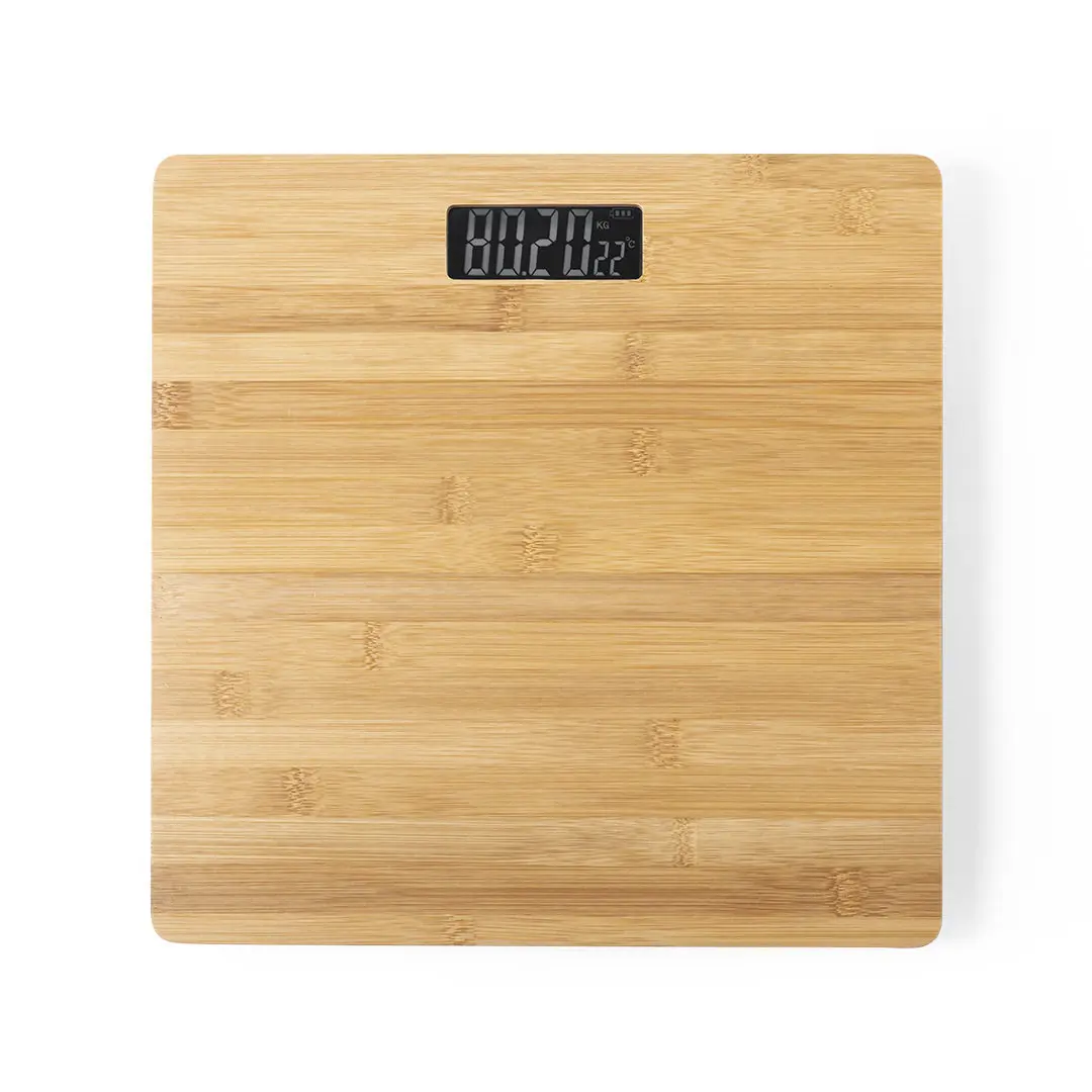 Natuurlijn weegschaal van bamboe, met anti-slip basis. Digitaal display, met functies voor automatische uitschakeling, temperatuur, tarra en keuze van de weegeenheid. Werkt op batterijen (2xAAA niet inbegrepen). Gepresenteerd in een aantrekkelijke eco-design doos.