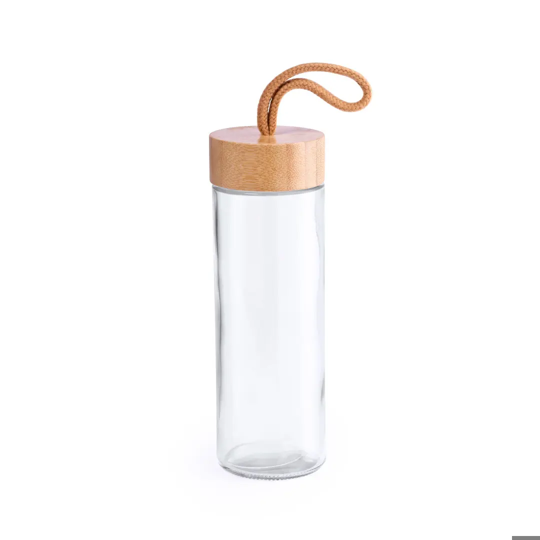 Drinkfles inhoud 420ml. Met een glazen onderkant en draaidop van bamboe. Met draaglus. Gepresenteerd in een individuele, designdoos.
