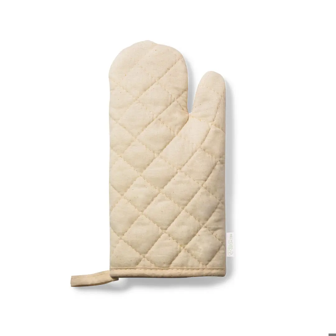 Nature line keukenhandschoen. Gemaakt van hoogwaardig 100% gerecycled katoenmateriaal. Met één effen zijde voor bedrukking en ophanglint. Buitenlabel met logo van gerecycled katoen.