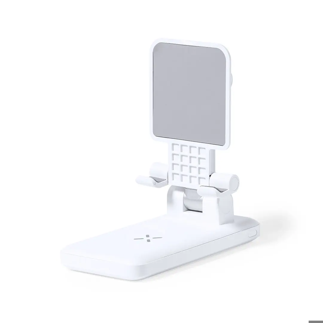 Alles-in-één opvouwbare multifunctionele houder, gemaakt van duurzaam wit ABS. Verstelbaar in hoogte en hoek voor een optimaal zicht op het scherm van de smartphone. Geïntegreerde 10W draadloze oplader en 5.000 mAh batterij, met Type-C ingang/uitgang, micro USB ingang en twee USB uitgangen. Compatibel met draadloos opladen van mobiele apparaten, inclusief Type-C oplaadkabel en gepresenteerd in een aantrekkelijke designdoos.De capaciteiten van al onze externe hulpbatterijen zijn reëel. Ze bevatten allemaal niet-gerecyclede batterijen van klasse A, met een levensduur van ten minste 500 laadcycli, en voldoen aan de CE-regelgeving. Bovendien zijn ze vervaardigd volgens RoHS-normen, en voldoen ze aan de volgende veiligheidseisen: Overlaadbeveiligingssysteem voor de powerbank. Volledig ontladingsbeveiligingssysteem, dat de duurzaamheid van de powerbank verhoogt. Blokkeersysteem om kortsluiting te voorkomen. Constant oplaadoverdrachtsysteem, in overeenstemming met de capaciteit van het doelapparaat.