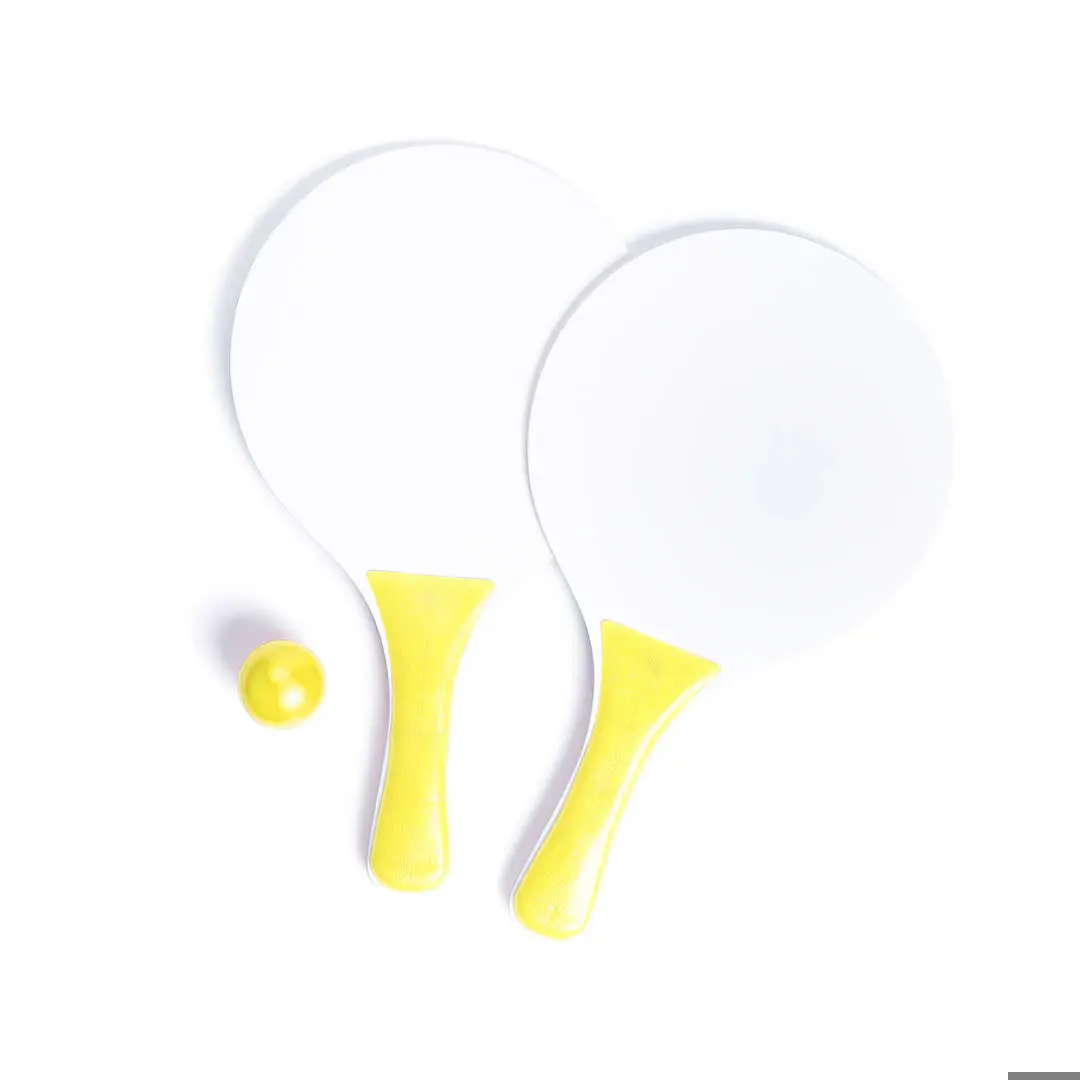 Set beach rackets van hout met versterkt handvat in gevarieerde kleuren. Gepresenteerd in een tas van mesh met bal in bijpassende kleur.