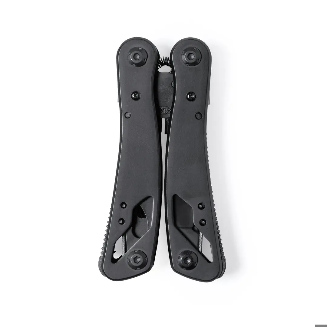 Multitool met accessoires in RVS met zwarte finish, en bijpassende resistente aluminium handgreep. Met 12 functies, waaronder mes, schroevendraaier, vijl, opener en tang. Opvouwbaar en compact van formaat, gepresenteerd in een individuele doos in zwart design.