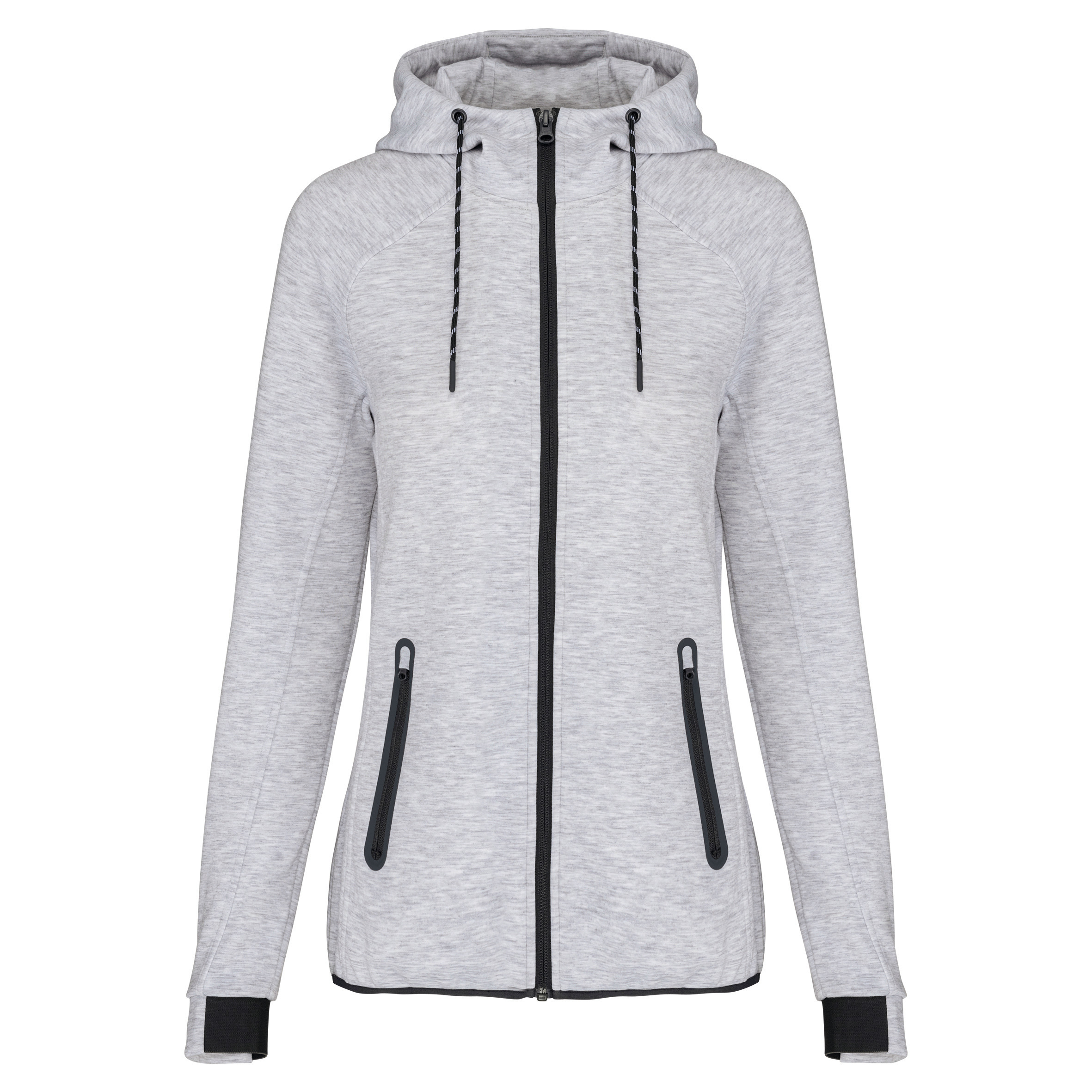 94% polyester/ 6% elasthan. (Heather : 79% polyester/ 15% viscose/ 6% elasthan). Heel comfortabele stof. Ritssluiting. 2 ritszakken met warmtegelaste afwerking aan de voorkant. Capuchon met jerseyvoering van 65% polyester/ 35% viscose met tweekleurige aanrijgkoordjes, afgewerkt met een plastic uiteinde. Nauwsluitende mouwuiteinden met een contrasterend, elastisch stuk. Onderkant kledingstuk afgewerkt met een contrasterende biaisband. Black op alle kleuren en Dark Grey op de Ash Heather (sluitingen ook). Heel comfortabele stof. Ritssluiting. 2 ritszakken met warmtegelaste afwerking aan de voorkant.