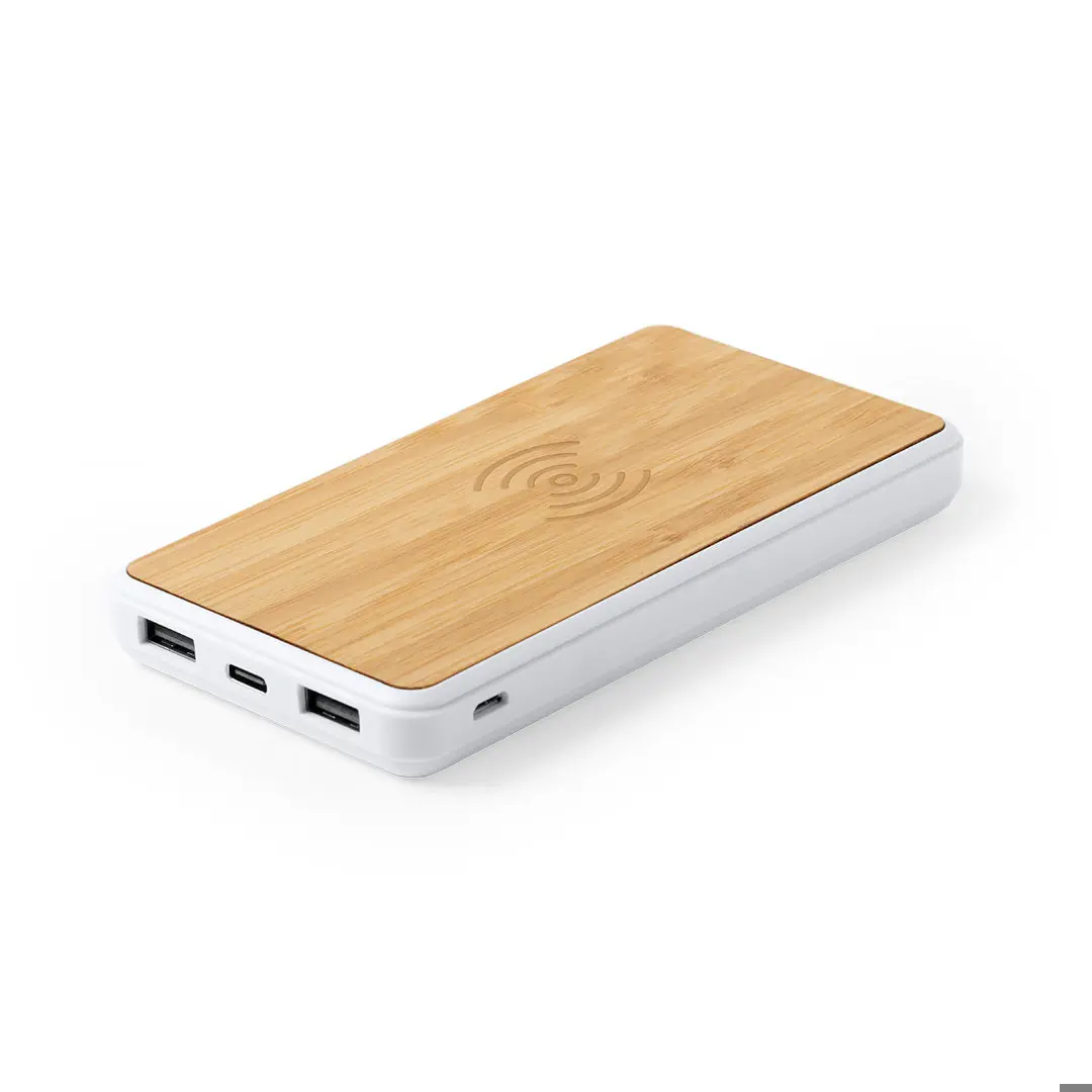 8000 mAh, powerbank met geïntegreerde draadloze oplader. In de natuurlijn, met schaal in bamboehout. Dubbele USB-uitgang, met Type C en micro-USB-ingangen - inclusief kabel - Breed afdrukgebied en gepresenteerd in een aantrekkelijke, individuele ontwerpdoos. De capaciteiten die worden weergegeven in al onze externe hulpbatterijen zijn echt, allemaal met niet-gerecyclede batterijen van klasse A, met een levensduur van minstens 500 laadcycli en die voldoen aan de CE-voorschriften. Bovendien worden ze vervaardigd volgens RoHS-normen en in overeenstemming met de volgende veiligheidseisen: Powerbank overlaad beveiligingssysteem. Volledig ontladingsbeschermingssysteem, dat de duurzaamheid van de powerbank verhoogt. Blokkeersysteem om kortsluiting te voorkomen. Constant laadoverdrachtssysteem, in overeenstemming met de capaciteit van het doelapparaat.