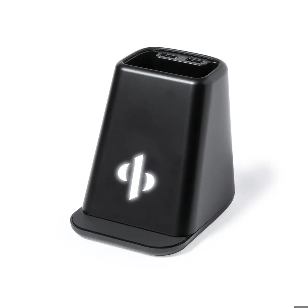Multifunctionele penhouder met licht, speciaal ontworpen voor laser branding en backlighting van het logo...Met smartphonehouder en geïntegreerde 15W draadloze oplader, compatibel met apparaten uitgerust met Qi draadloze oplaadtechnologie. Inclusief 2 USB-uitgangen (5V DC 2A) en 150cm Type C oplaadkabel. Antislip basis en gepresenteerd in een individuele kraft design doos, met handleiding in het Engels en Spaans...Vervaardigd volgens RoHS-normen en in overeenstemming met de volgende veiligheidseisen:..Beveiligingssysteem tegen oververhitting..Beveiligingssysteem tegen overbelasting..Blokkadesysteem om kortsluiting te voorkomen.