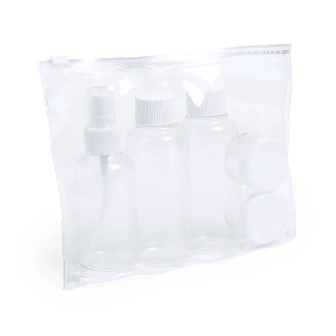Reisset / Toilettas met 5 verschillende accesoires in transparant ontwerp. Twee flesjes voor gel en shampoo, 1 voor parfum en twee voor creme.