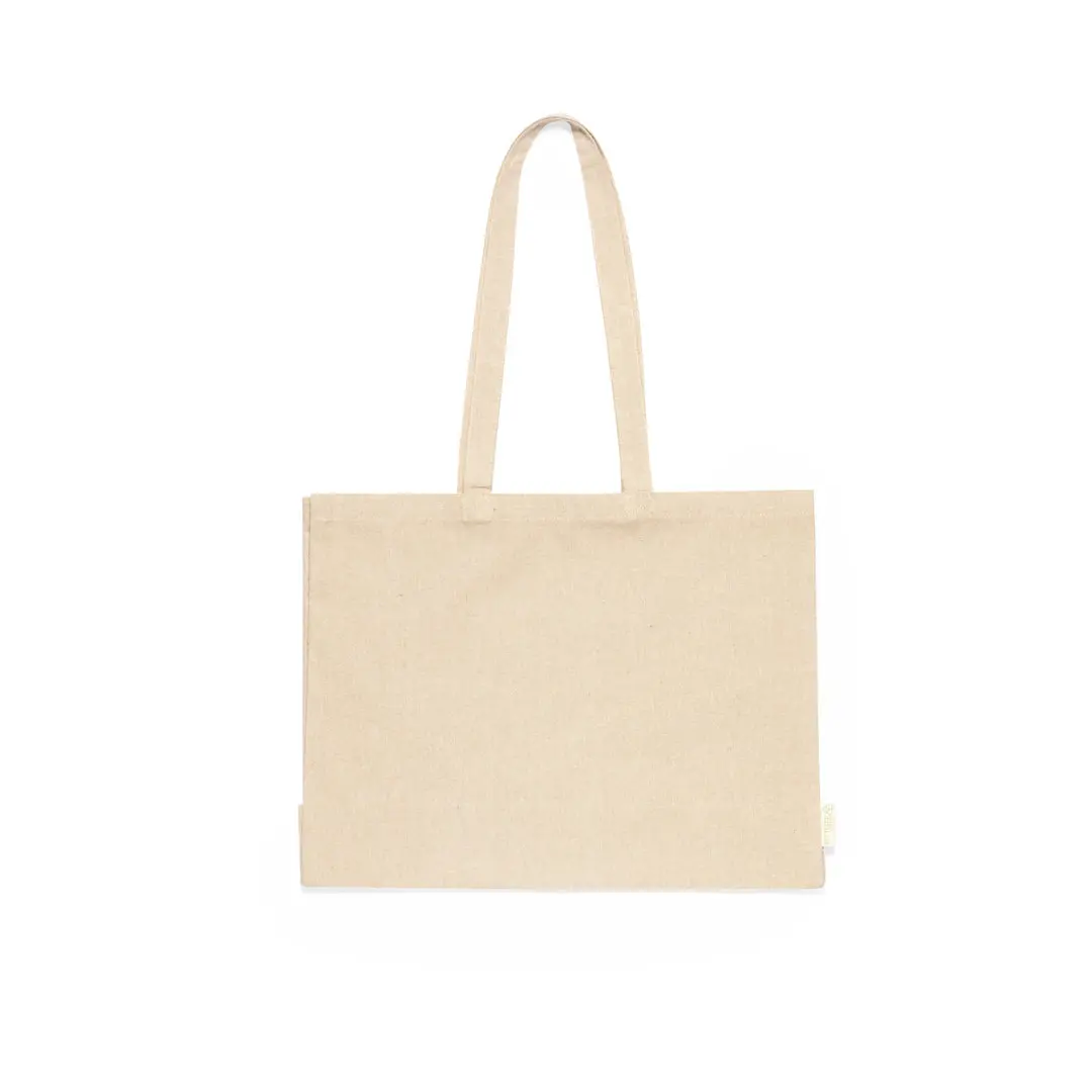 Tas ¨natuur lin¨, gemaakt van gerecycled katoen met hoge dichtheid (240g/m2). Gestikte afwerking en met lange versterkte hengsels (70 x 2.5cm). Met kruisje en verkrijgbaar in natuurlijke en zwarte kleuren, met label van gerecycled katoen aan de buitenkant. Weerstand tot 10kg in gewicht...GRS-certificering (Global recycled standard) beschikbaar, die de gerecyleerde oorsprong grandeert van het materiaal dat is gebruikt om het product te vervaardigen.