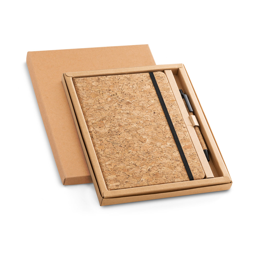 Set van A5 notitieblok en kurken balpen. Notitieblok met 192 gelinieerde ivoorkleurige pagina's. Balpen met blauwe inkt. Geleverd in een kartonnen geschenkdoos.140 x 210 mm