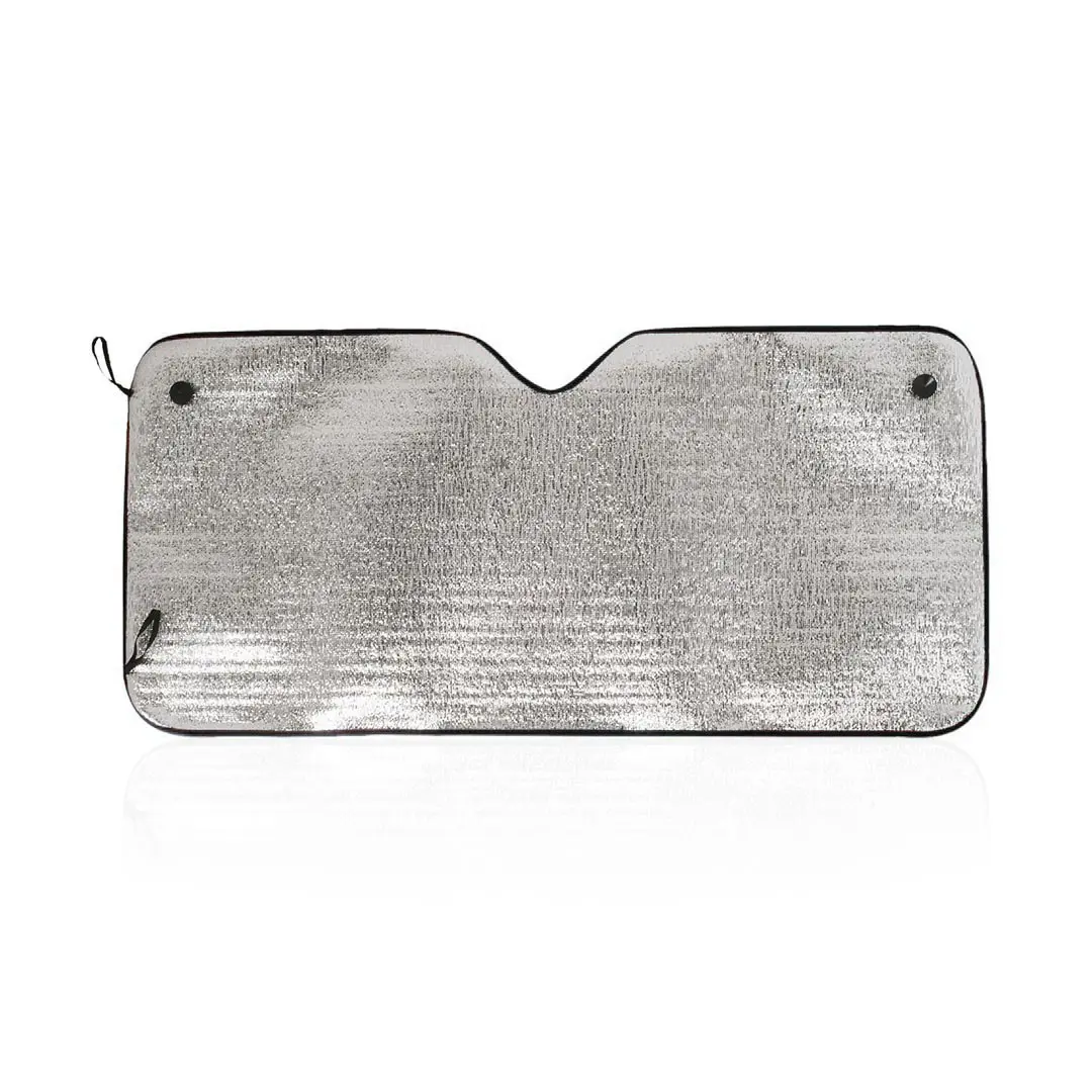 Zonnescherm van aluminium aan één zijde met zilver metallic afwerking en polyester randen in diverse kleuren. Maat 130x60cm en schuim aan de achterkant. Elastische verstelriempjes met metalen verstevigingsringen, twee zuignappen voor bevestiging en uitgevouwen presentatie voor eenvoudig printen.