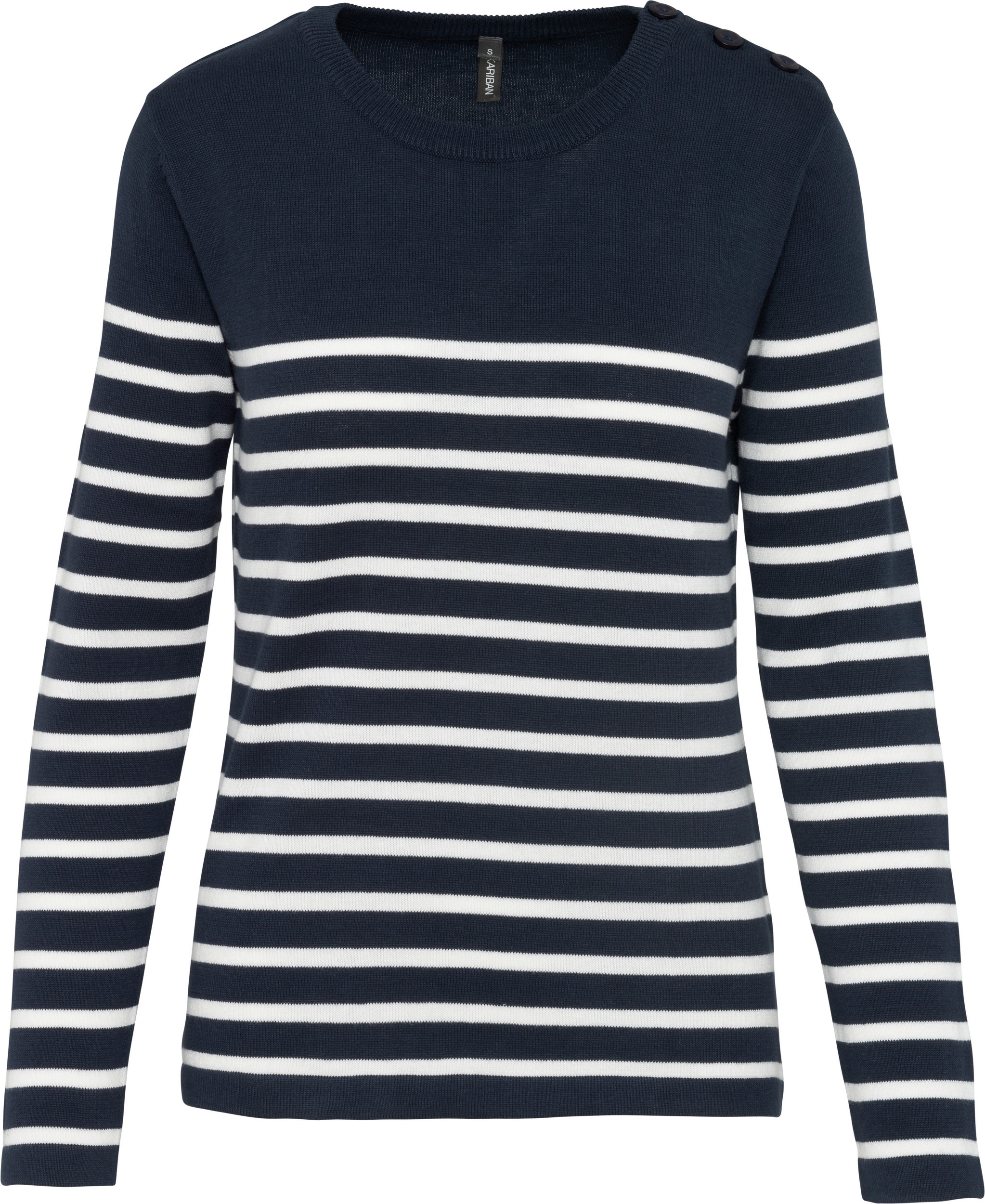 100% katoen. Gauge 12. Schouderopening links met 3 ton-sur-ton knopen. 1 x 1 ribboord aan de halsopening. Gebreide mouwuiteinden en onderkant kledingstuk in dubbele dikte. Tijdloze en klassieke gestreepte trui. Moderne snit voor een casual-chique look. Collectie Sailing. Gemaakt uit 100% katoen.
