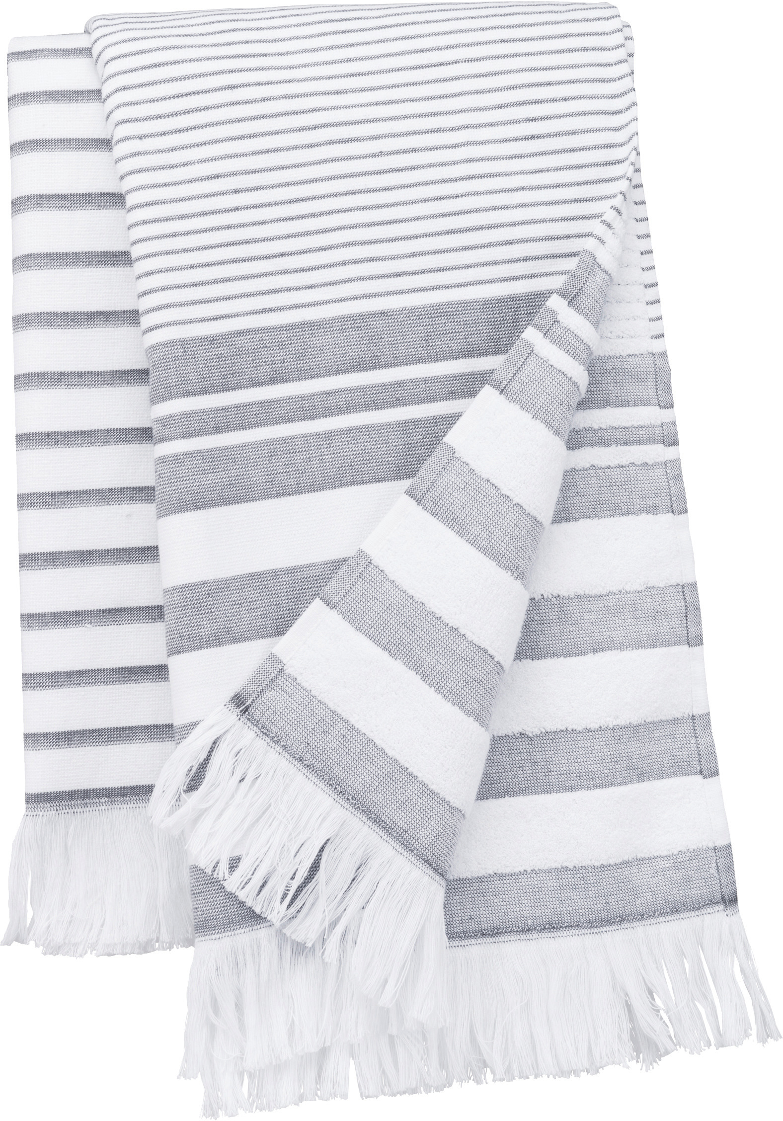 100% katoen. Afmetingen: 100 cm x 180 cm. Eén zijde van geweven jacquardkatoen en één zijde van badstof. Gecertificeerd STANDARD 100 by OEKO-TEX®N° CQ1007/6, IFTH. Gestreept motief met franjes. Geweven jacquardkatoen aan 1 kant en spons aan de andere kant. Gemaakt uit 100% katoen.