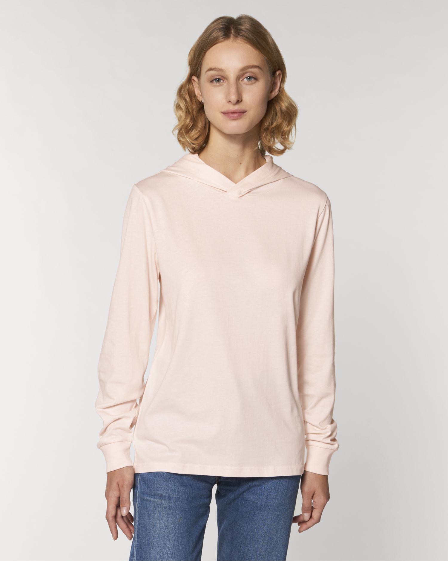 Uniseks t-shirt met capuchon. Normale pasvorm, Ronde hals met kap, Long Sleeve, Enkelvoudige jersey. Ingezette mouwen