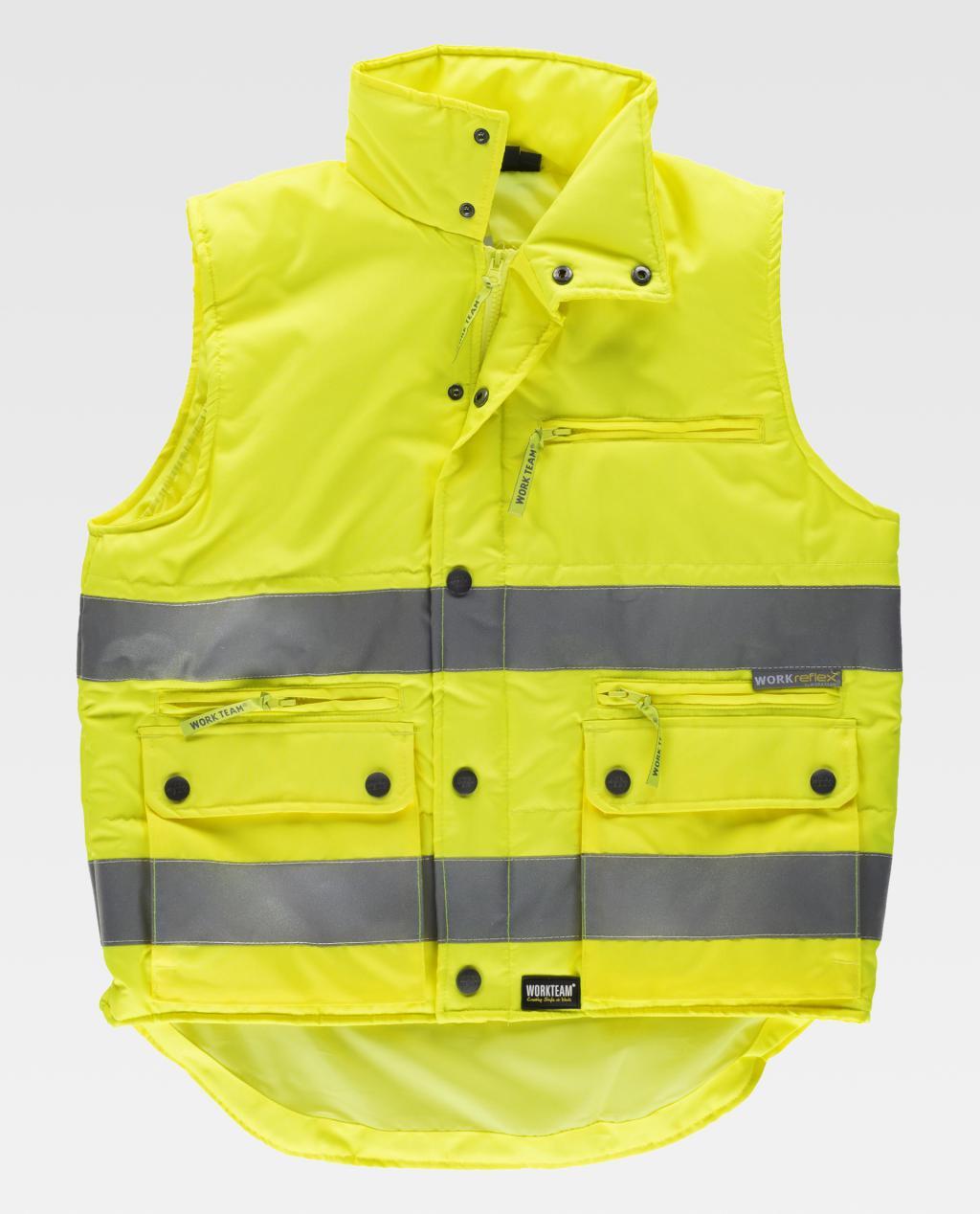 Goed zichtbaar gewatteerd vest van Oxford-stof met reflecterende banden. Opstaande kraag en nylon ritssluiting verborgen door een haak-en-oogflap. Een borsttas en twee binnenzijden met ritssluiting. Twee tassen met balg en een map met beugels aan de zijkanten. Een opgestikte borsttas met klittenbandsluiting aan de binnenkant. Twee reflecterende strepen op de borst en rug. Verstelbare armsgaten. Elastiek aan de zijkanten van de taille. Goed zichtbaar gewatteerd vest van Oxford-stof met reflecterende banden. Opstaande kraag en nylon ritssluiting verborgen door een haak-en-oogflap. Een borsttas en twee binnenzijden met ritssluiting. Twee tassen met balg en een map met beugels aan de zijkanten. Een opgestikte borsttas met klittenbandsluiting aan de binnenkant. Twee reflecterende strepen op de borst en rug. Verstelbare armsgaten. Elastiek aan de zijkanten van de taille. Vertrouw op Bananawork, al 15 jaar leider in gepersonaliseerde werkkleding en werkuniformen en verras uw klanten en medewerkers met elk relatiegeschenk uit ons brede assortiment.