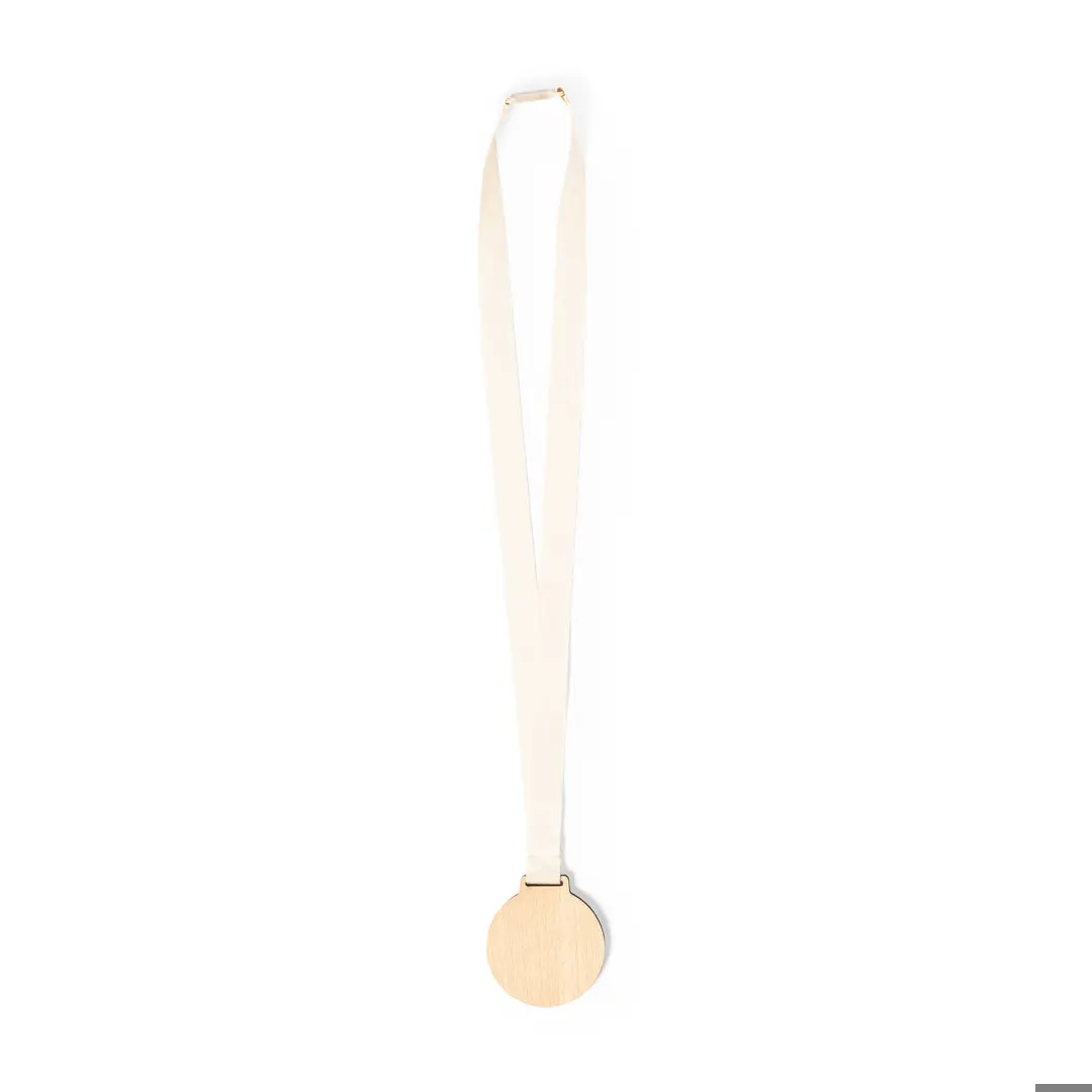 Natuurlijnmedaille gemaakt van natuurlijk hout. Lanyard gemaakt van 100% katoen, met tarwestro veiligheidssluiting in de nek.