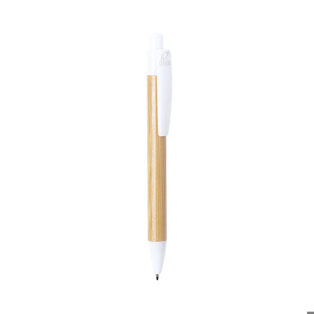 Natuurlijn balpen met opdrukmechanisme. Combinatie van een lichaam in glanzende bamboe en accessoires in PLA -PolyLactic Acid-, dat wordt verkregen uit 100% natuurlijke grondstoffen zoals maïszetmeel, yucca of suikerriet, en aan het einde van zijn levensduur 100% composteerbaar kan worden gemaakt. Clip met een groot markeeroppervlak en verkrijgbaar in een brede waaier van kleuren, met blauwe inkt. PLA-label bovenop de clip