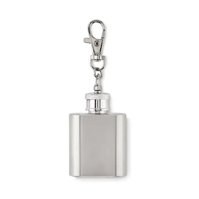 Sleutelhanger heupfles in roestvrij staal. Inhoud: 28 ml.