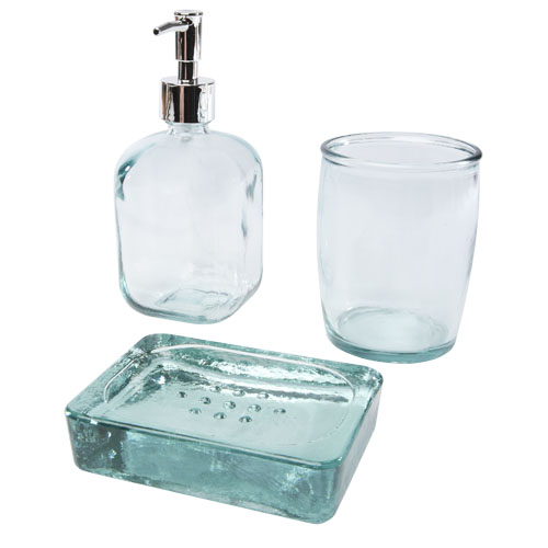 3-delige badkameraccessoireset van 100% gerecycled glas met een zeepdispenser (450 ml), een beker (430 ml) en zeepbakje (13 x 10 cm). Gerecycled glas wordt geproduceerd met minder energie, grondstoffen en toevoegingen, dan wat nodig is voor het maken van traditioneel glas. Vaatwasserbestendig.