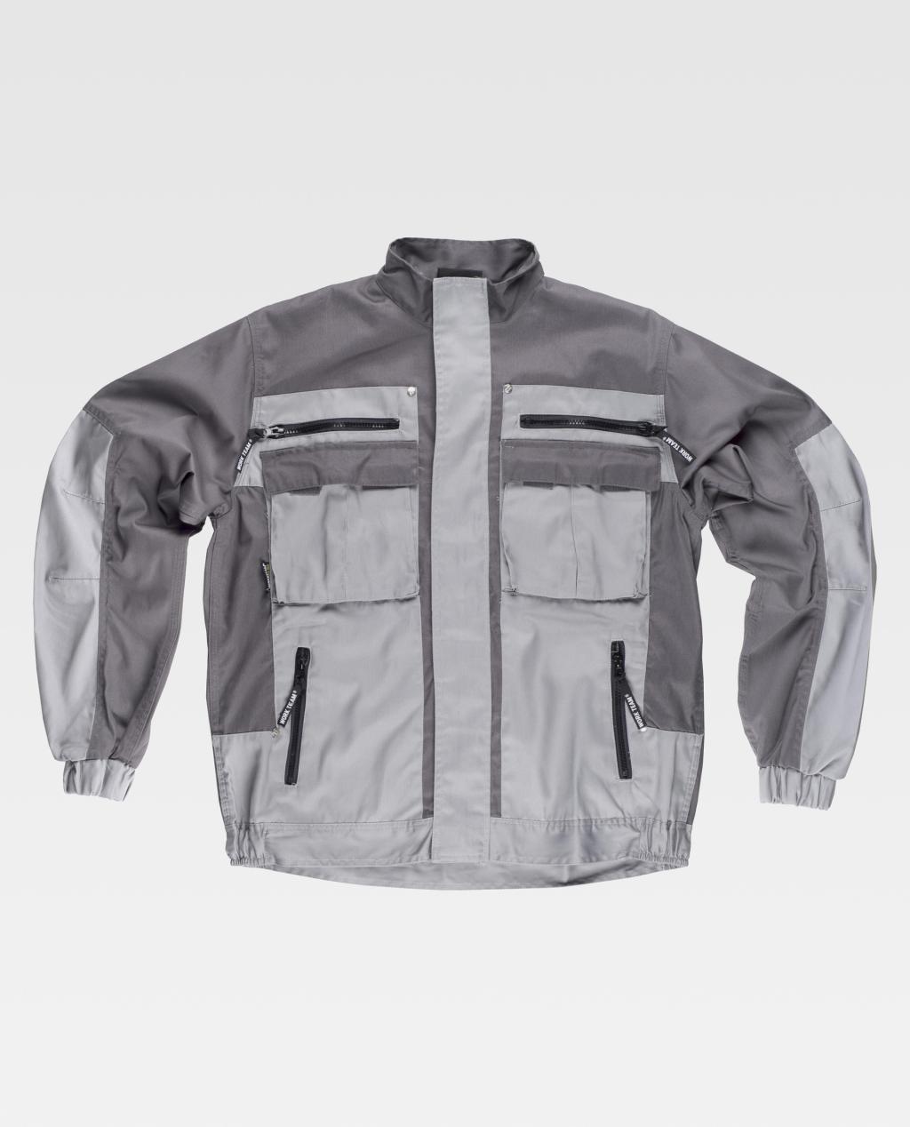 Gecombineerd jack met driedubbele stiksels en schouderpas op de rug. Hoge hals en nylon ritssluiting verborgen door een valse flap met klittenband. Twee borstzakken aan de binnenkant met ritssluiting en twee dubbele zakken met plooi en klittenband. Twee zijzakken met ritssluiting aan de binnenkant. Gecombineerde mouwen. Elastische manchet. Elastiek aan de zijkanten van de taille.