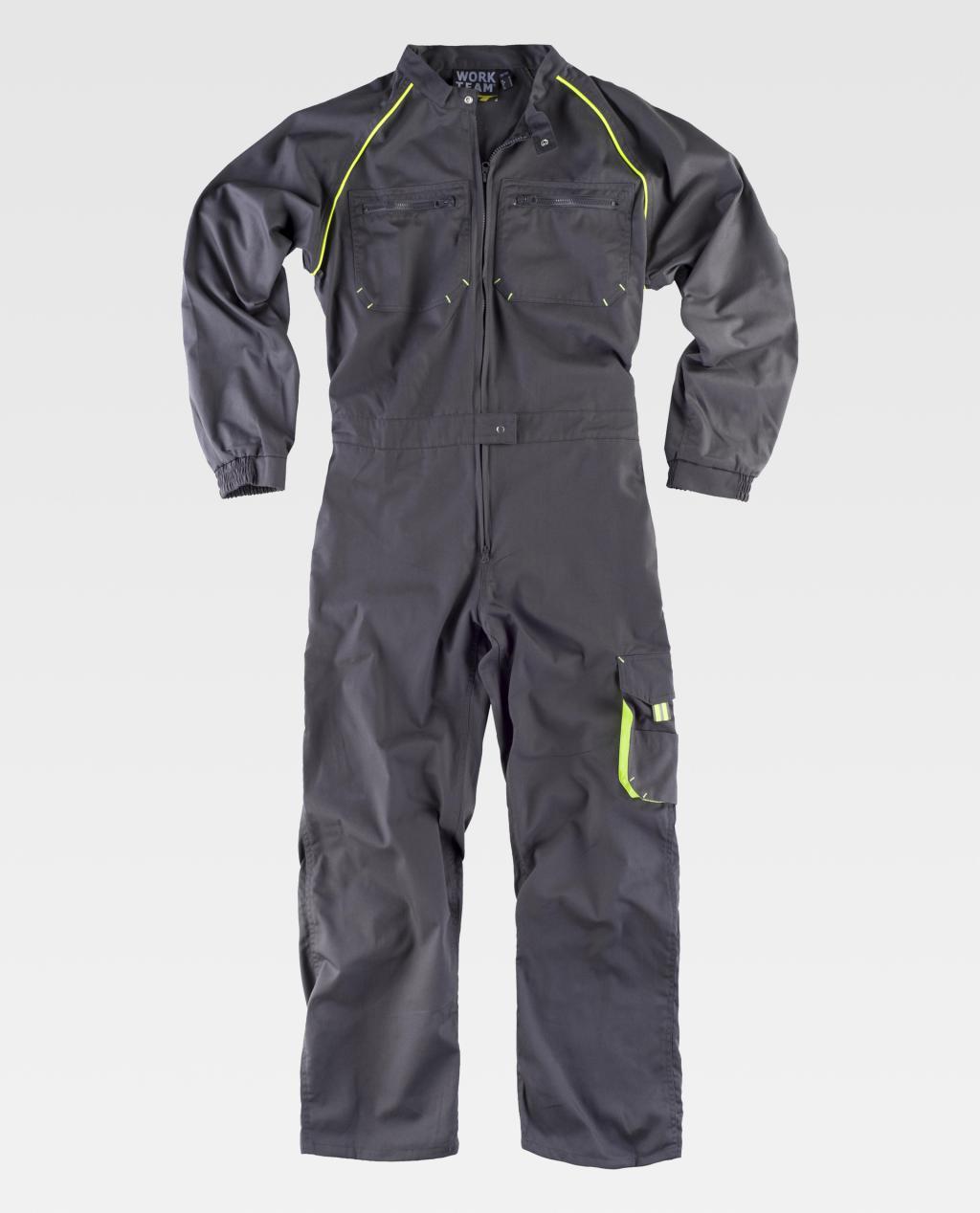Jumpsuit met raglanmouwen en fluorescerende reflecterende details, biezen en contrasterende lussen. Riemkraag met klittenbandsluiting en dubbele nylon ritssluiting. Twee opgestikte borstzakken met ritssluiting, twee schuine zijzakken, een cargozak aan de zijkant met opgestikte zak, flap met klittenband en treklipje. Twee opgestikte achterzakken met klittenband en handvat en een dubbele spatelzak. Elastische manchet. Haak-en-oog tailleband. Elastiek op de rug.