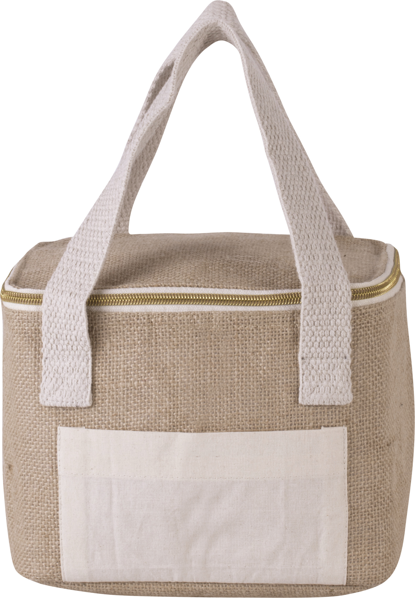 Koeltas met buitenzijde van jutecanvas en katoenen zak voor eenvoudige personalisatie, koelvak binnenin met isolerende wand van aluminium en koelschuim met hoge densiteit. Katoenen hengsels. Klein model. Buitenkant in sterke, milieuvriendelijke natuurlijke jute. Katoenen zak voor een eenvoudige personalisatie en extra opbergruimte. Heel isolerende binnenkant.