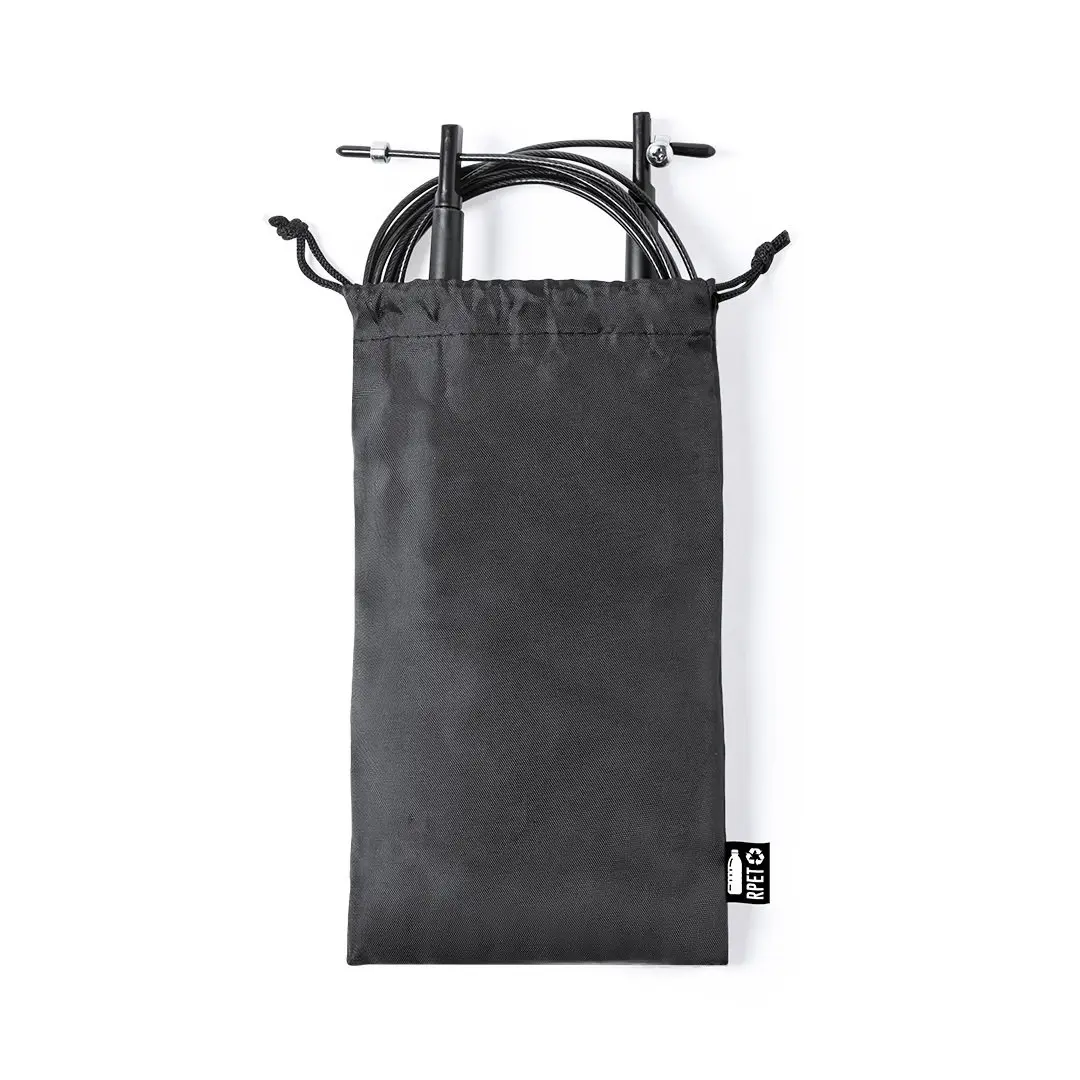 Verstelbaar touw van topkwaliteit, 3 m lang, met ergonomische handgrepen, gemaakt van staal met een resistente PVC-coating. Gepresenteerd in een RPET polyester zakje met koordsluiting, gemaakt van gerecycled plastic om het hergebruik van plastic afval te bevorderen en bij te dragen aan de duurzaamheid van de planeet. RPET embleem op het etiket van het zakje.