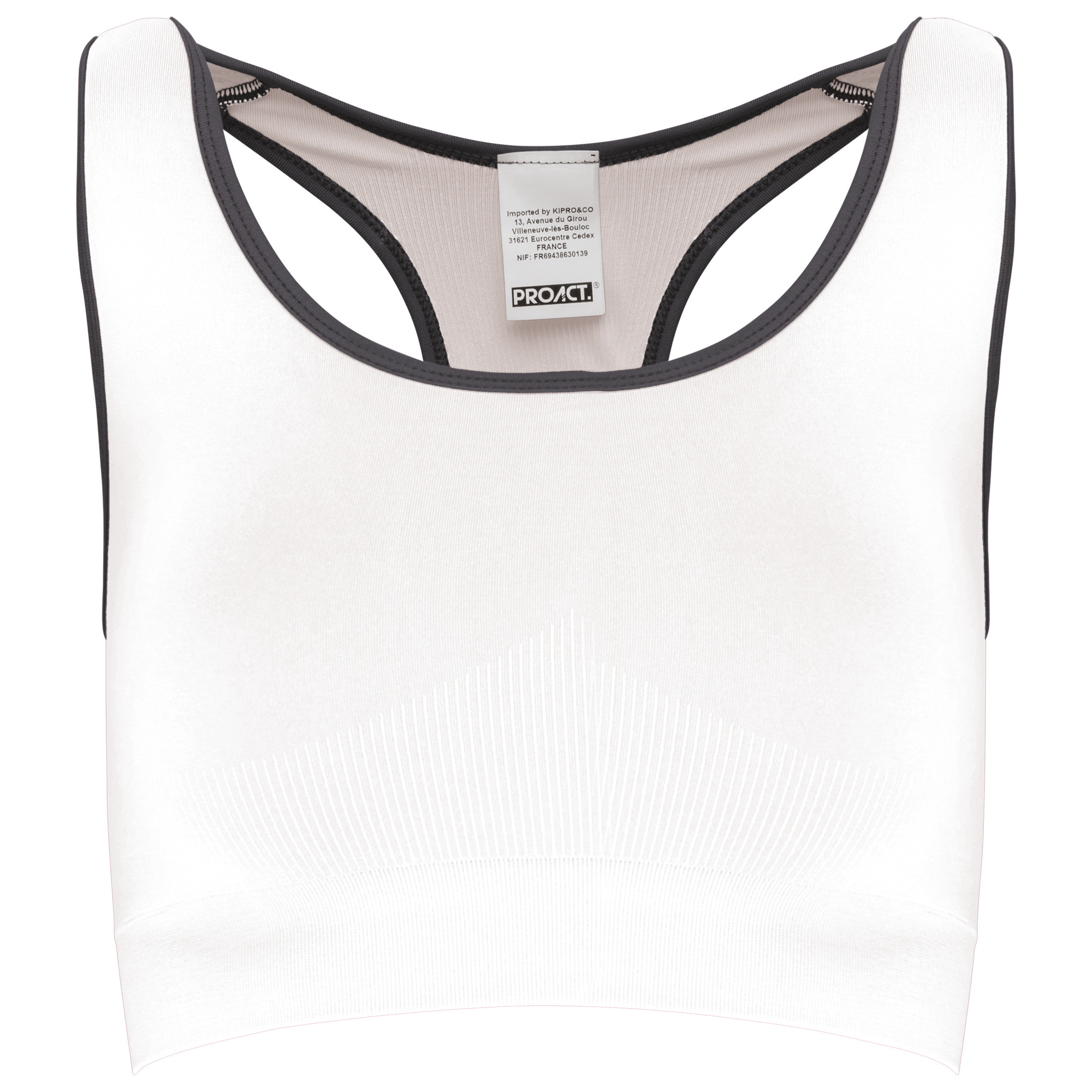 94% polyamide / 6% elasthan. Racerback. Gevoerde stof en ergonomisch tricot voor een uitstekende ondersteuning en comfort dankzij het naadloos ontwerp. Contrasterend biesje aan halsopening en mouwopeningen. Geschikt voor verschillende sporten. Gecertificeerd STANDARD 100 by OEKO-TEX® N° CQ 1007/8, IFTH. Blijft uitstekend zitten Naadloos voor meer comfort Ideaal voor verschillende sporten