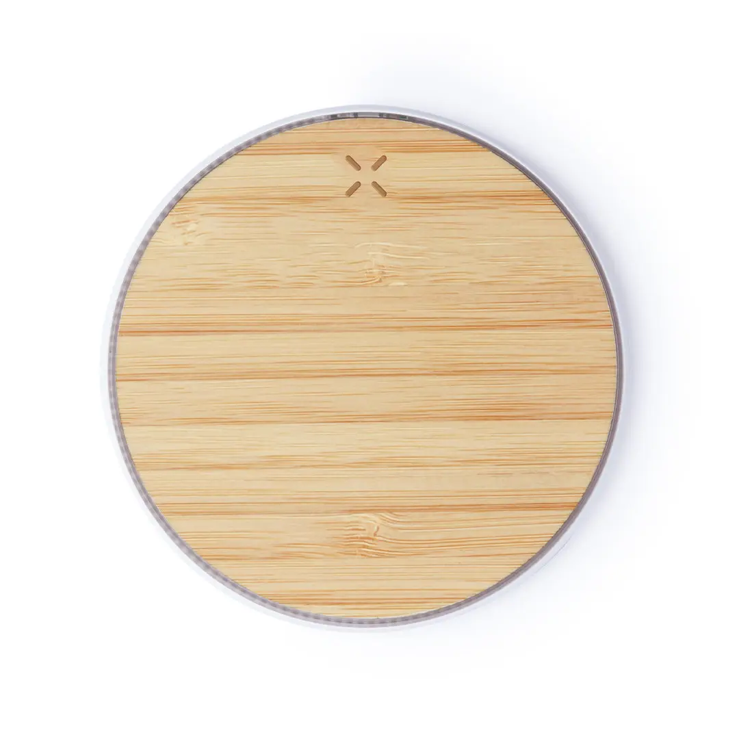 Draadloze eco oplader in bamboehout. Antislipvoet, compatibel met apparaten die zijn uitgerust met draadloze oplaadtechnologie en gepresenteerd in een aantrekkelijke designdoos. Inclusief USB-kabel.