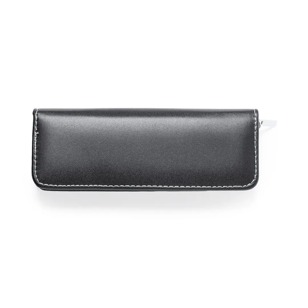 Premium balpen en roller set. Gemaakt van een elegante combinatie van zwart PU en verchroomd metaal. Balpen met draaimechanisme in blauwe inkt en jumbo cartridge. Roller met dop en gel inkt in blauw, jumbo cartridge. Gepresenteerd in individuele PU etui met ritssluiting en bijpassende binnenkant met individuele compartimenten.