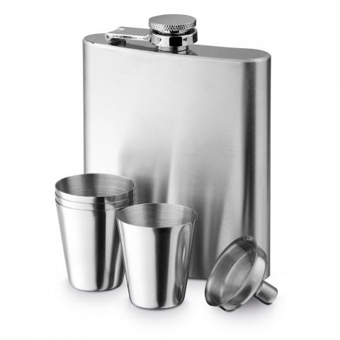 Set met RVS heupfles (200 ml), trechter en 4 bekers met een inhoud tot 20 ml. Geleverd in geschenkverpakking.189 x 40 x 168 mm
