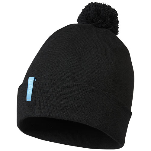 Duurzame promotionele hoofddeksels. Enkellaags beanie met dubbel gevouwen rand. Bijpassende pompon. Luslabel met merknaam. Gemaakt van 4 gerecyclede PET-flessen.