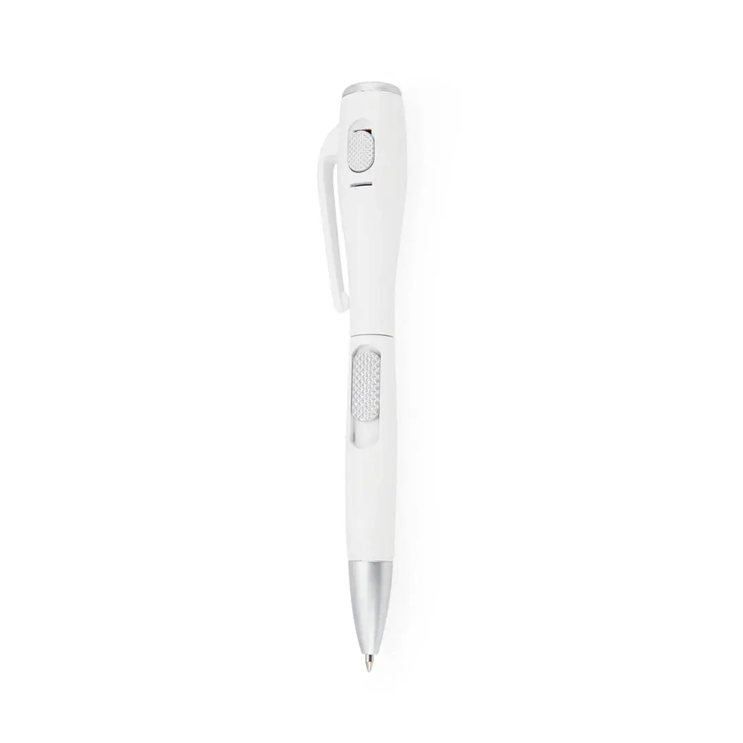 Balpen met ingebouwde LED-zaklamp. Zijmechanisme en minimalistisch ontwerp in een originele combinatie van grijze en witte kleuren. In blauwe inkt met knoopcelbatterijen inbegrepen.