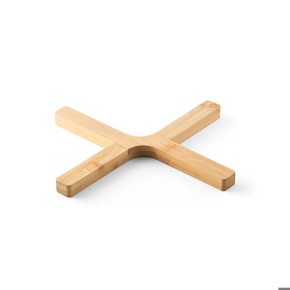 Opvouwbare bamboe potstandaard. Geleverd in een geschenkverpakking van kraftpapier. Gesloten: 215 x 40 x 14 mm | Open: 180 x 150 x 14 mm