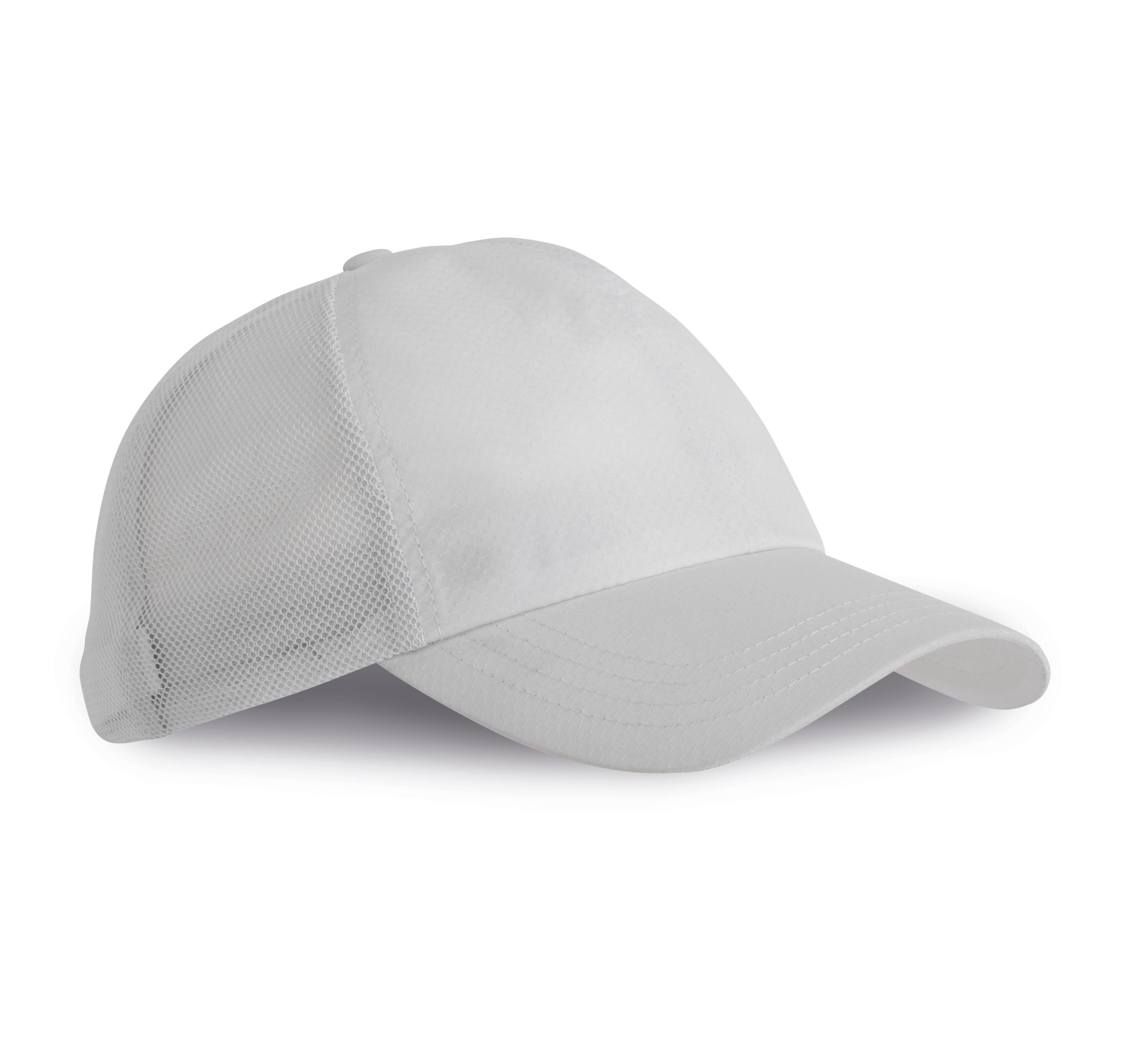 100% polyester. Sportpet met 6 panelen. De voorste panelen en de panelen van mesh zijn gemaakt van zacht aanvoelend polyester. De maat kan worden geregeld met een lus en met de metalen gesp op de achterzijde. Stevig en zacht polyester. Afstelling met een metalen gesp op de achterkant, voor een betere pasvorm tijdens inspanningen.