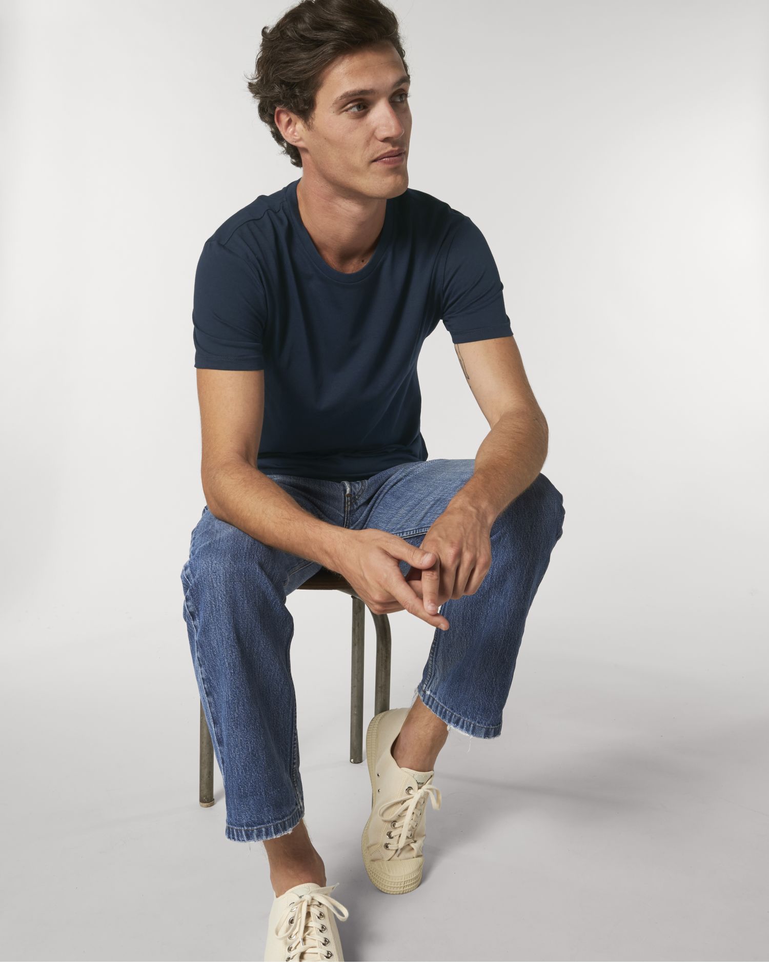 Nauwsluitend mannen-T-shirt . Aansluitende pasvorm, Ronde hals, Short Sleeve, Enkelvoudige jersey. Ingezette mouwen Hals met 1x1-ribboord Verstevigingsband in de hals, gemaakt van het hoofdmateriaal Smal dubbel sierstiksel onderaan de mouwen en onderaan het lijfje