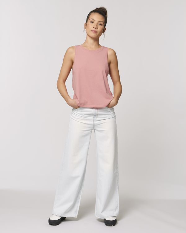 Korte vrouwentopje. Comfortabele pasvorm, Ronde hals, Sleeveless, Enkelvoudige jersey. Mouwloos Hals met 1x1-ribboord bij de hals en mouwinzetten Verstevigingsband uit single jersey in de hals Smal dubbel sierstiksel onderaan het lijfje