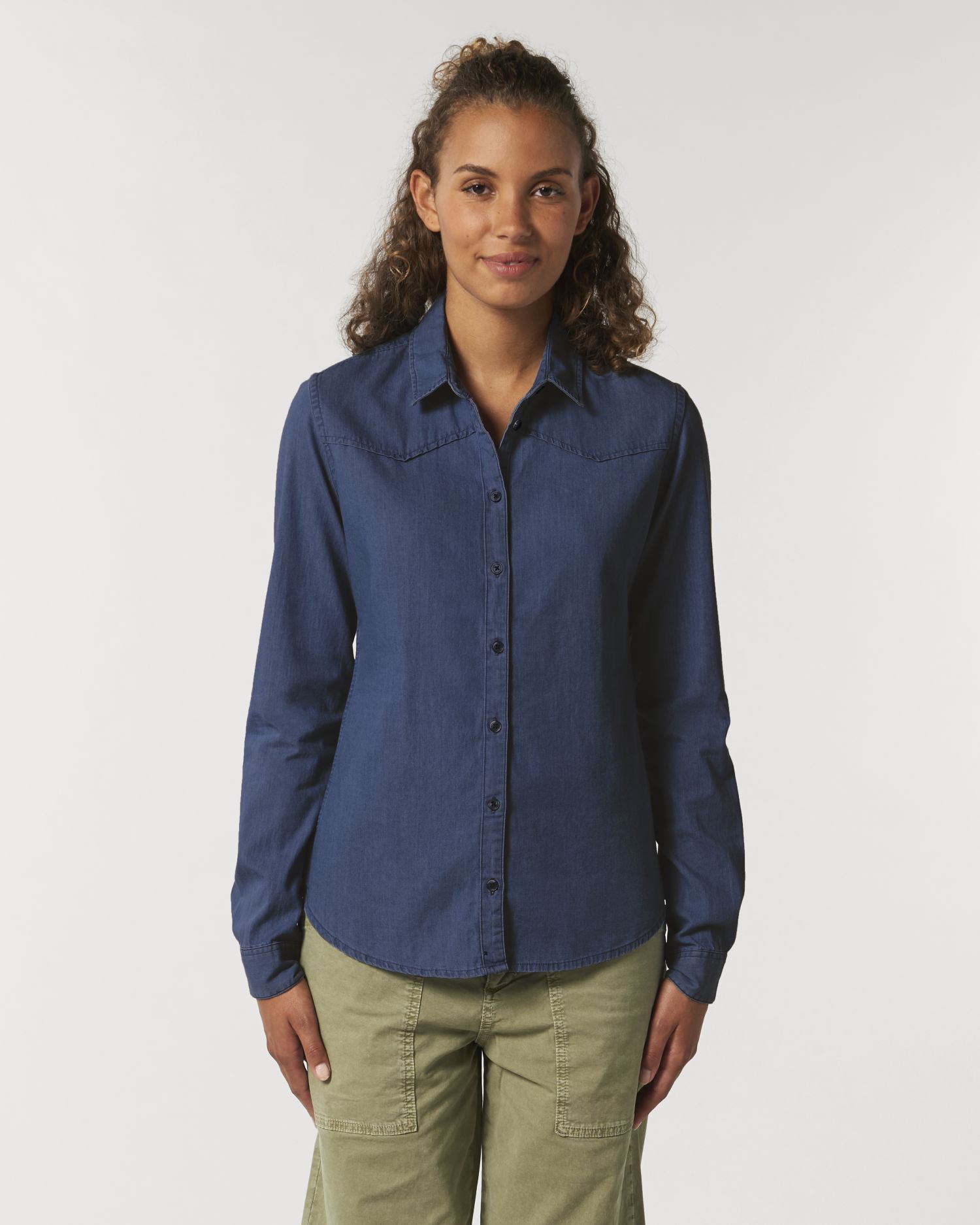 Vrouwenhemd van denim. Normale pasvorm, Ronde hals, Cuff Sleeve, Geweven denim. Opstaande kraag