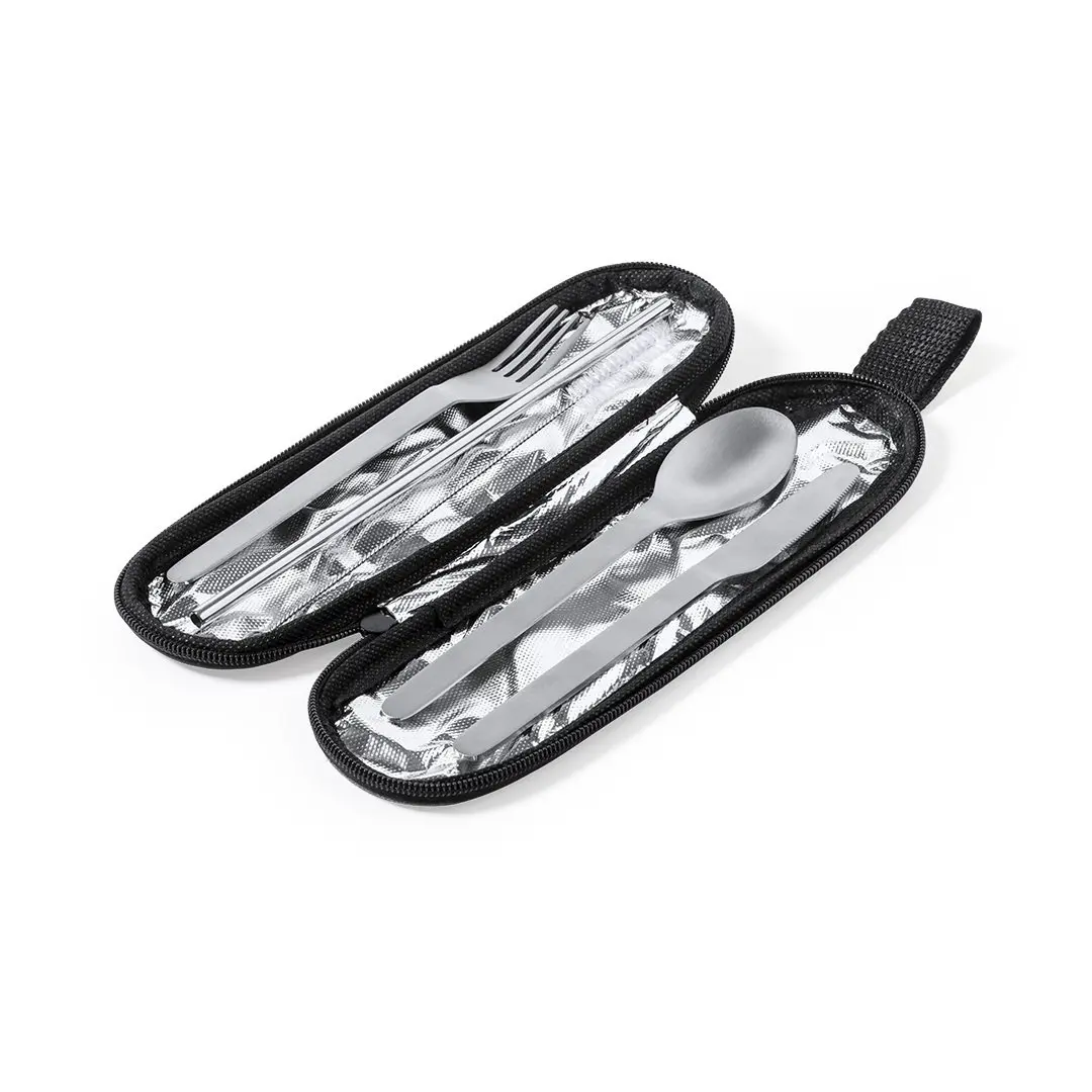 Herbruikbare bestekset gemaakt van sterk en duurzaam roestvrij staal. Inclusief lepel, mes, vork, rietje en reinigingsaccessoire. Gepresenteerd in een elegant, individueel 300D RPET polyester etui gemaakt van gerecycled plastic, om het hergebruik van plastic afval aan te moedigen en de duurzaamheid van de planeet te helpen. Gepresenteerd in een individueel etui met draagriem, ritssluiting en RPET embleem op het etiket aan de buitenkant.