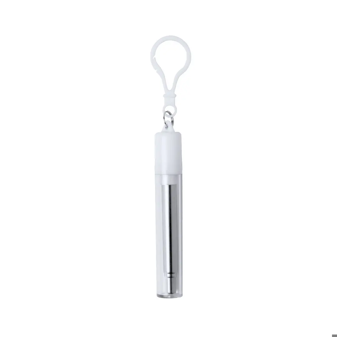 Herbruikbaar en rekbaar rietje in roestvrij staal met siliconen punt. Inclusief reinigingsaccessoire en gepresenteerd in een transparante koffer met draagaccessoire.