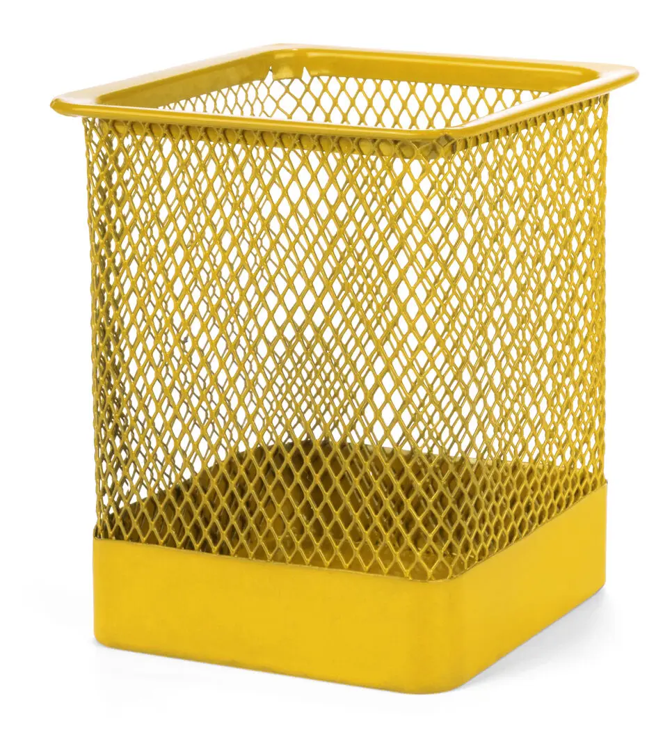Metalen mesh pennenbakje in diverse kleuren. Gepresenteerd in een individuele doos.