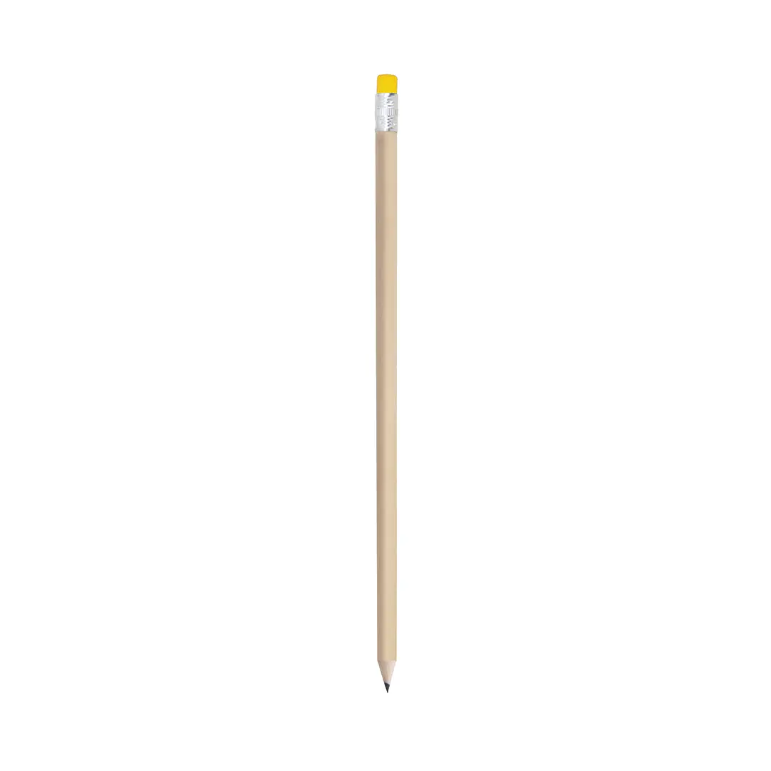 Houten potlood met rond lichaam en een gum aan het uiteinde, in een natuurlijke afwerking in gevarieerde kleuren.