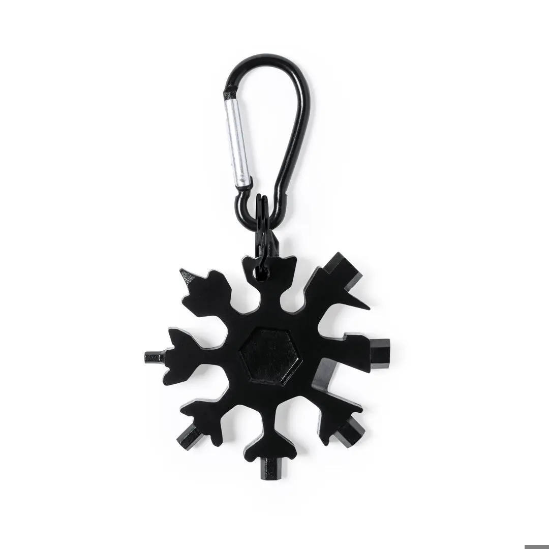 Echt en handig multitool gemaakt van resistent roestvrij staal in zwarte afwerking, met bijpassende ring en dragende karabijnhaak. Met 17 functies, waaronder platte en philips tips schroevendraaier; zeshoekige inbussleutels; mes en flesopener. Gepresenteerd in een individuele zwarte doos.