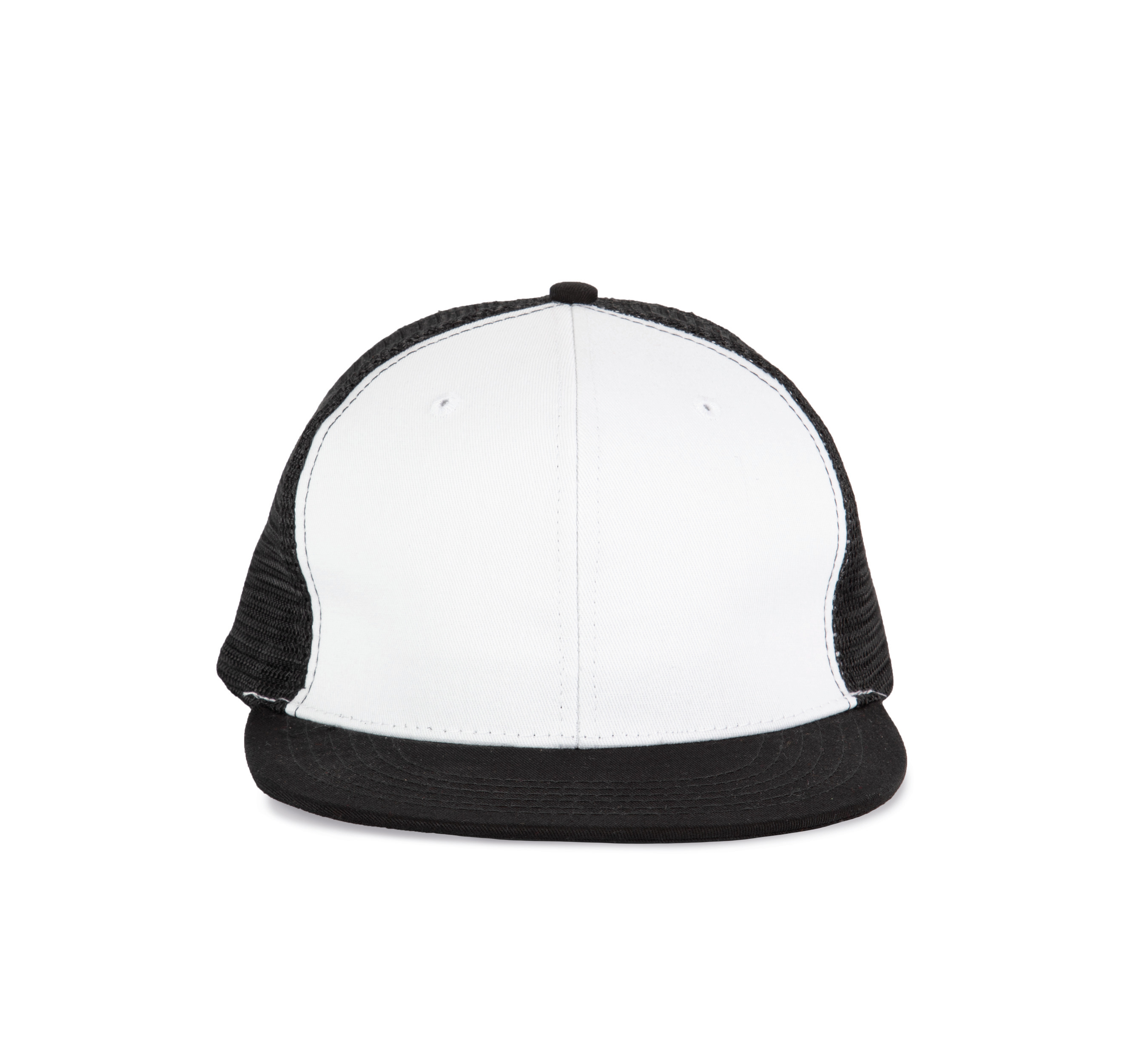 100% katoenen cap met 100% polyester mesh. 6 verstevigde panelen met platte klep. Katoenen zweetband. Verstelbare plastic sluiting. Platte zonneklep. Zweetband met katoenen voering. Plastic tong, voor een snelle en handige afstelling.