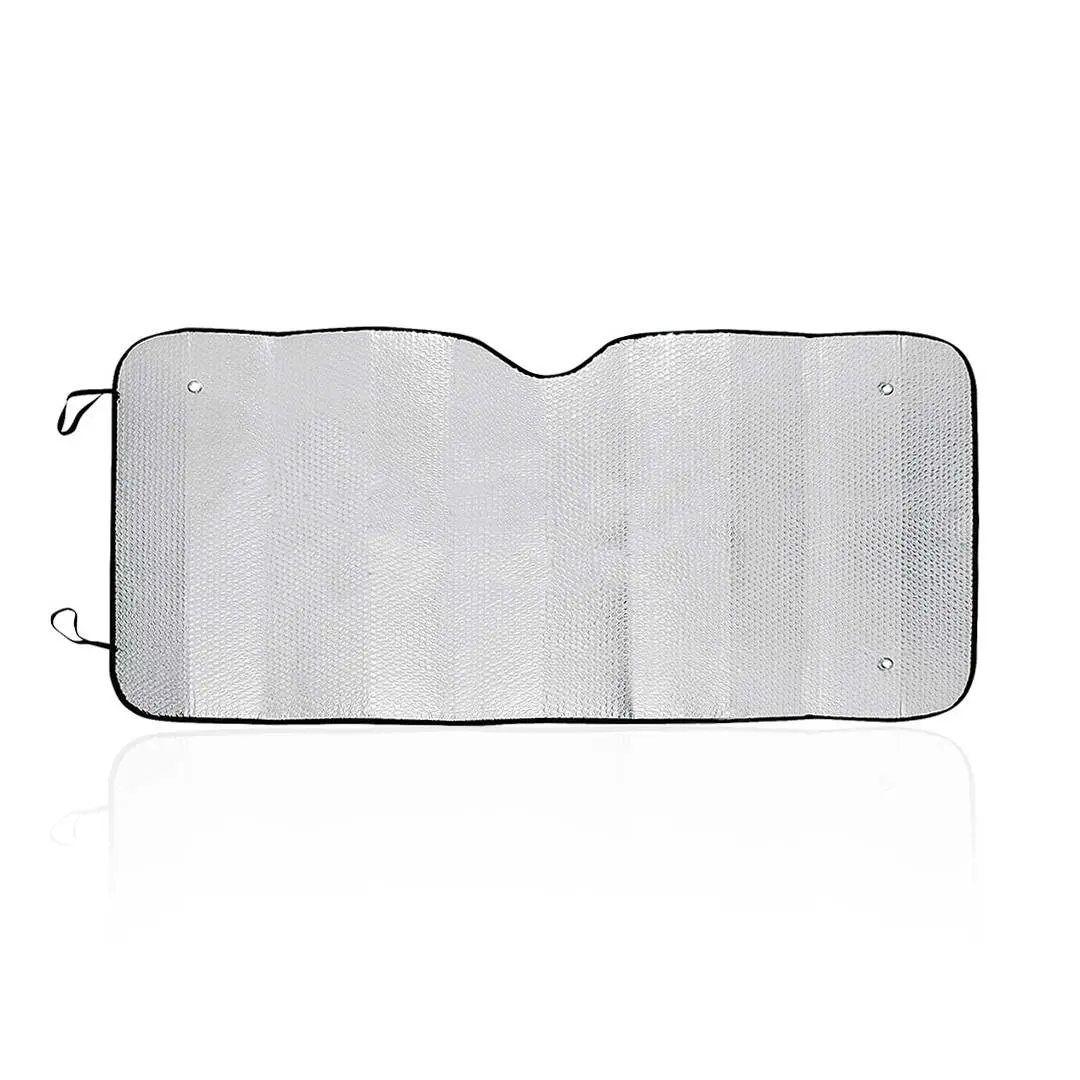 Zonnescherm van aluminium beide zijden met zilver metallic afwerking met zwarte bies. Maxi 143x74cm groot, met metalen verstevigingsringen, elastische banden om te vouwen, twee zuignappen voor bevestiging en ontvouwen gepresenteerd voor eenvoudig printen.