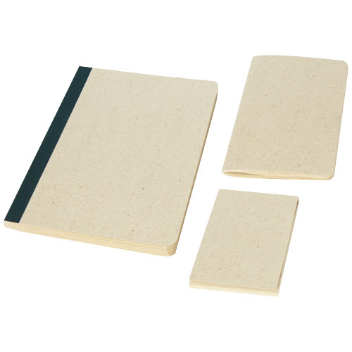 Geschenkset bestaande uit een A5-formaat flexibel notitieboek met 64 vellen, een klein gestikt boekje (10 x 15 cm) en een memoblok (8 x 11,5 cm). De drie artikelen zijn gemaakt van 90 g/m2 graspapier dat tot 40% grasvezels bevat en een lage milieu-impact heeft. Er wordt minder water en energie gebruikt in het productieproces in vergelijking met gewoon papier en er worden geen chemicaliën gebruikt. Alle items zijn gemaakt in Europa en dragen bij aan een lagere CO2-voetafdruk.