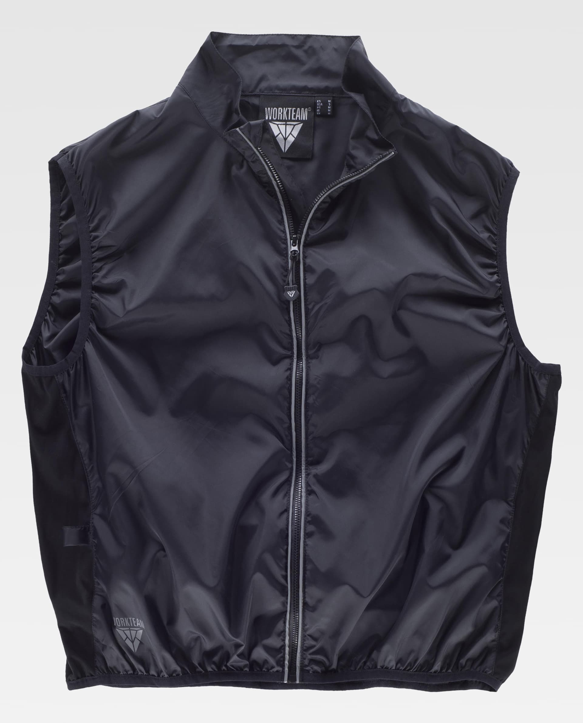 Fietsvest gecombineerd met tas op de rug. Vest met hoge hals en nylon ritssluiting. reflecterende details. Een tas op de achterkant van plastón. Geribbeld met elastische biais. Penlus aan één kant. Zijkanten van elastische en comfortabele stof voor meer bewegingsvrijheid.