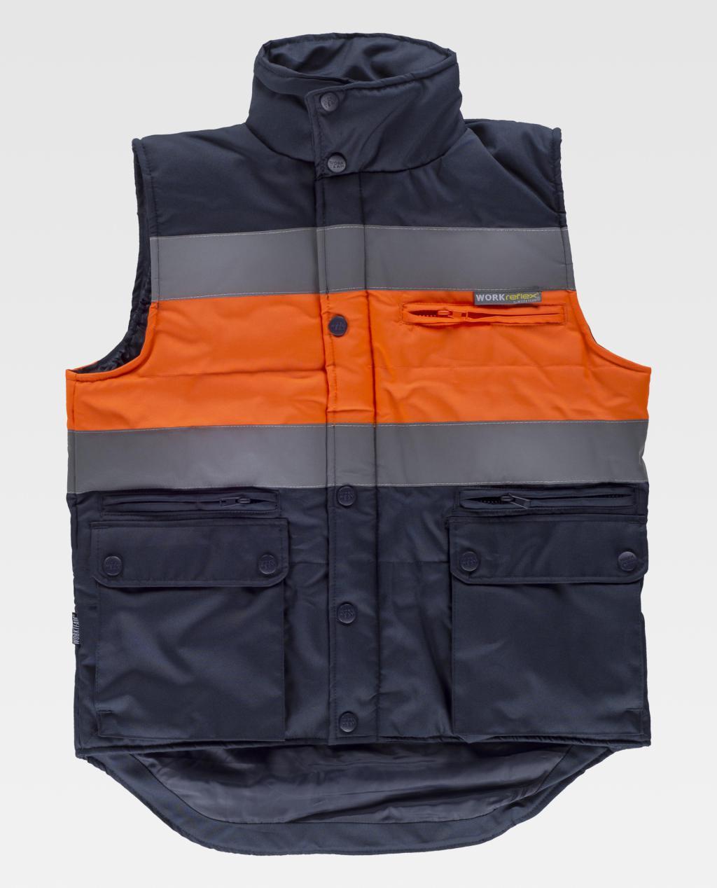 Gecombineerd gewatteerd vest van Oxford-stof met reflecterende banden. Opstaande kraag en nylon ritssluiting verborgen door een haak-en-oogflap. Een borsttas en twee binnenzijden met ritssluiting. Twee tassen met balg en een map met beugels aan de zijkanten. Een opgestikte borsttas met klittenbandsluiting aan de binnenkant. Twee reflecterende banden op de borst en rug met een goed zichtbaar middenstuk. Verstelbare armsgaten. Elastiek aan de zijkanten van de taille GECOMBINEERD GEVOERD VEST VAN OXFORD-STOF EN REFLECTERENDE BANDEN om te personaliseren met uw logo. Geen verzendkosten. Hoeveelheidskortingen tot 60%. Bereken uw prijs online