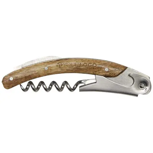 Wijnhouderset van acacia hout. De set bevat een kelnersmes met een kurkentrekker en een intrekbaar foliemes, en functioneert ook als wijnfleshouder. Een perfect cadeau voor wijnliefhebbers.