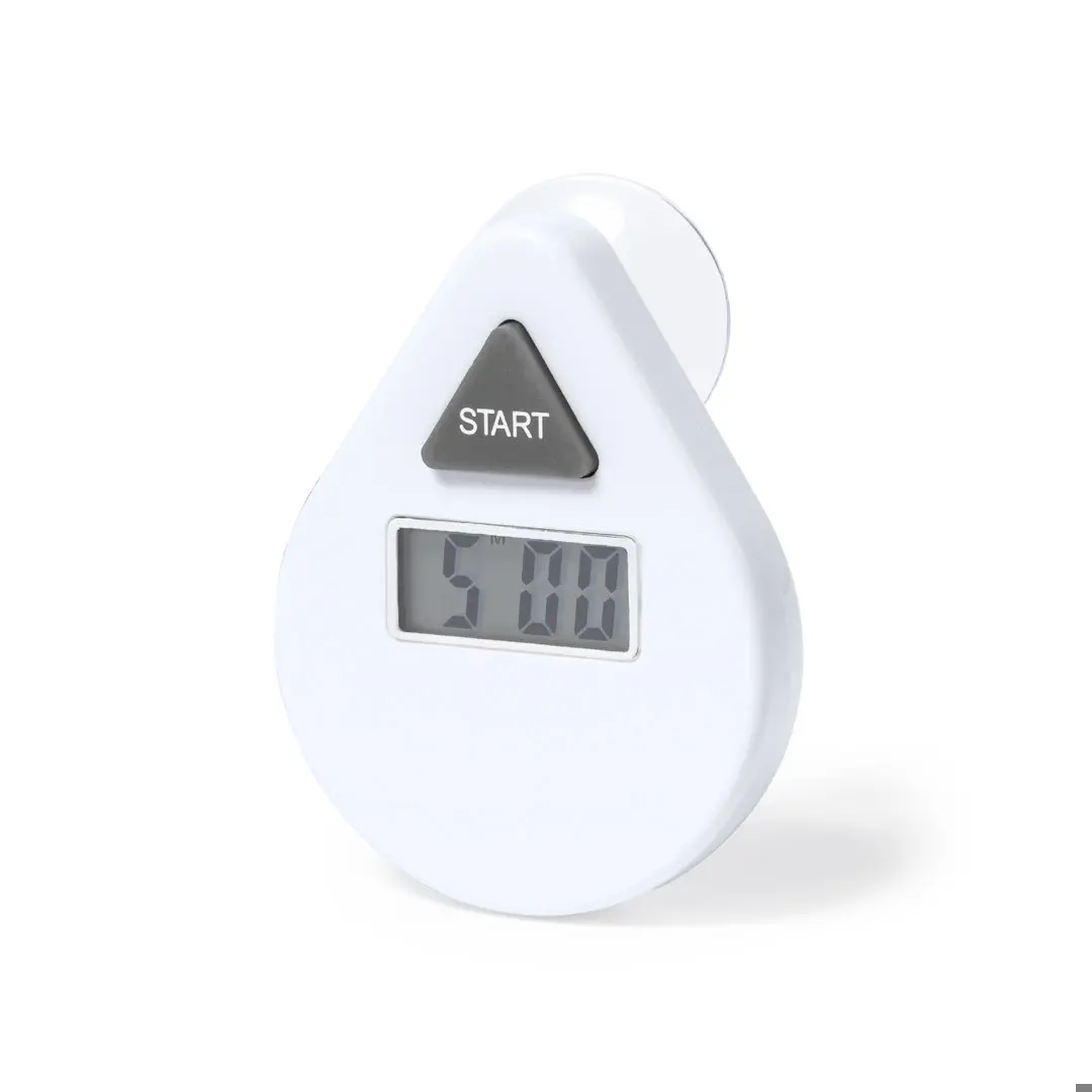 Timer van resistent ABS, met witte afwerking en zuignapbevestiging. Gemakkelijk af te lezen LCD-display, met aftelknop (5 minuten). Werkt op batterijen (knoopcel inbegrepen). Gepresenteerd in een individuele kraft ontwerp doos, met handleiding in het Engels en Spaans.